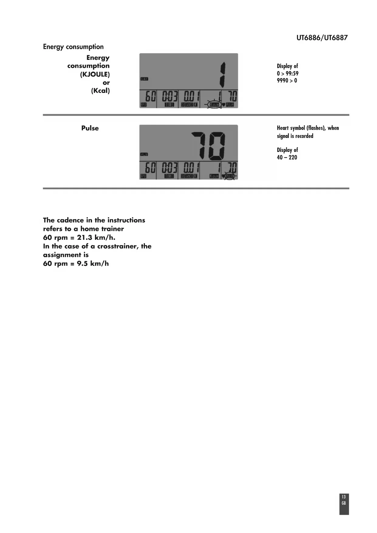(Kcal) Heart symbol (flashes), when signal is recorded The cadence in the instructions refers to a home trainer 60 rpm = 21.3 km/h. In the case of a crosstrainer, the assignment is 60 rpm = 9.5 km/h14