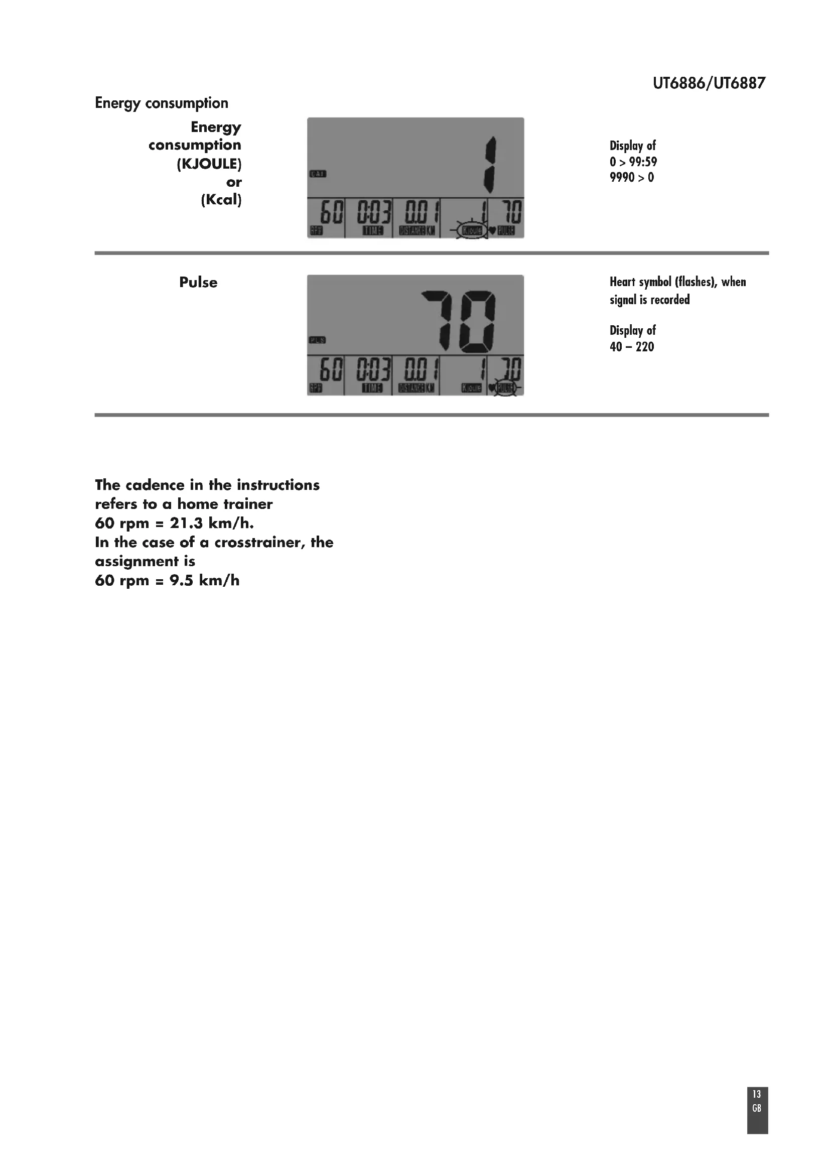 (Kcal) Heart symbol (flashes), when signal is recorded The cadence in the instructions refers to a home trainer 60 rpm = 21.3 km/h. In the case of a crosstrainer, the assignment is 60 rpm = 9.5 km/h14