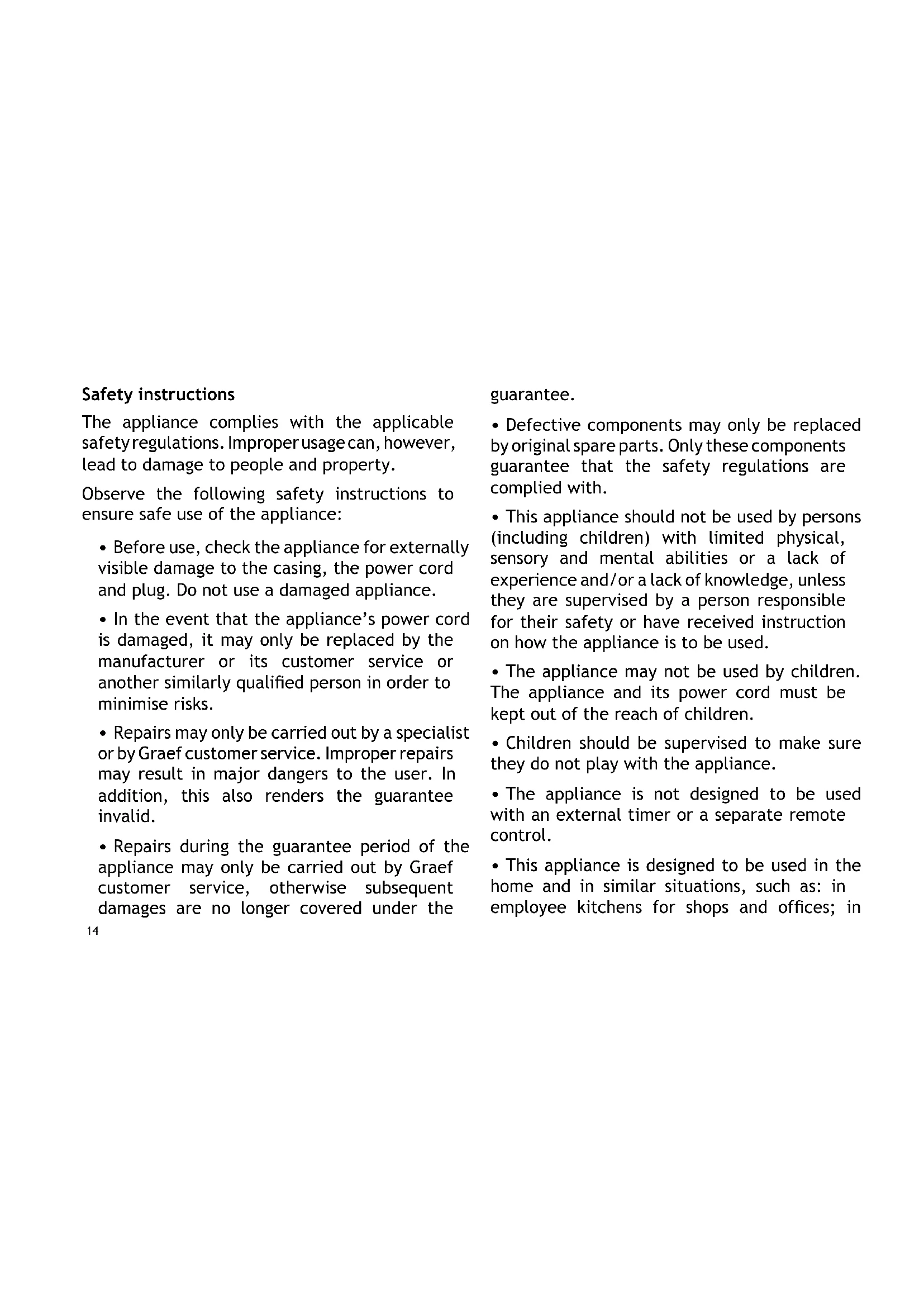 - Repairs during the guarantee period of the appliance may only be carried out by Graef customer service, otherwise subsequent damages are no longer covered under the guarantee.