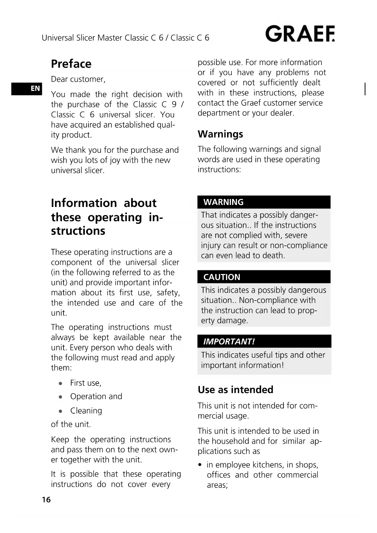 Preface Dear customer, You made the right decision with the purchase of the Classic C 9 / Classic C 6 universal slicer. You have acquired an established qual- ity product. We thank you for the purchase and wish you lots of joy with the new universal slicer. Information about these operating in- structions These operating instructions are a component of the universal slicer (in the following referred to as the unit) and provide important infor- mation about its rst use, safety, the intended use and care of the unit. The operating instructions must always be kept available near the unit. Every person who deals with the following must read and apply them: ● First use, ● Operation and ● Cleaning of the unit. Keep the operating instructions and pass them on to the next own- er together with the unit. It is possible that these operating instructions do not cover every possible use. For more information or if you have any problems not covered or not sufciently dealt with in these instructions, please contact the Graef customer service department or your dealer. Warnings The following warnings and signal words are used in these operating instructions: WARNING That indicates a possibly danger- ous situation.. If the instructions are not complied with, severe injury can result or non-compliance can even lead to death. CAUTION This indicates a possibly dangerous situation.. Non-compliance with the instruction can lead to prop- erty damage. important! This indicates useful tips and other important information! Use as intended This unit is not intended for com- mercial usage. This unit is intended to be used in the household and for similar ap- plications such as