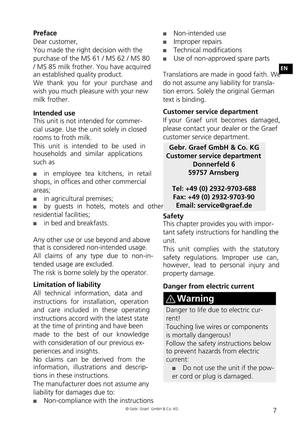 Preface Dear customer, You made the right decision with the purchase of the MS 61 / MS 62 / MS 80 / MS 85 milk frother. You have acquired an established quality product. We thank you for your purchase and wish you much pleasure with your new milk frother. Intended use This unit is not intended for commer- cial usage. Use the unit solely in closed rooms to froth milk. This unit is intended to be used in households and similar applications such as ■ in employee tea kitchens, in retail shops, in ofces and other commercial areas; ■ in agricultural premises; ■ by guests in hotels, motels and other residential facilities; ■ in bed and breakfasts. Any other use or use beyond and above that is considered non-intended usage. All claims of any type due to non-in- tended usage are excluded. The risk is borne solely by the operator. Limitation of liability All technical information, data and instructions for installation, operation and care included in these operating instructions accord with the latest state at the time of printing and have been made to the best of our knowledge with consideration of our previous ex- periences and insights. No claims can be derived from the information, illustrations and descrip- tions in these instructions. The manufacturer does not assume any liability for damages due to: ■ Non-compliance with the instructions ■ Non-intended use ■ Improper repairs ■ Technical modications ■ Use of non-approved spare parts Translations are made in good faith. We do not assume any liability for transla- tion errors. Solely the original German text is binding. Customer service department If your Graef unit becomes damaged, please contact your dealer or the Graef customer service department. Gebr. Graef GmbH & Co. KG Customer service department Donnerfeld 6 59757 Arnsberg Tel: +49 (0) 2932-9703-688 Fax: +49 (0) 2932-9703-90 Email: service@graef.de Safety This chapter provides you with impor- tant safety instructions for handling the unit. This unit complies with the statutory safety regulations. Improper use can, however, lead to personal injury and property damage. Danger from electric current Warning Danger to life due to electric cur- rent! Touching live wires or components is mortally dangerous! Follow the safety instructions below to prevent hazards from electric current: ■ Do not use the unit if the pow- er cord or plug is damaged.8