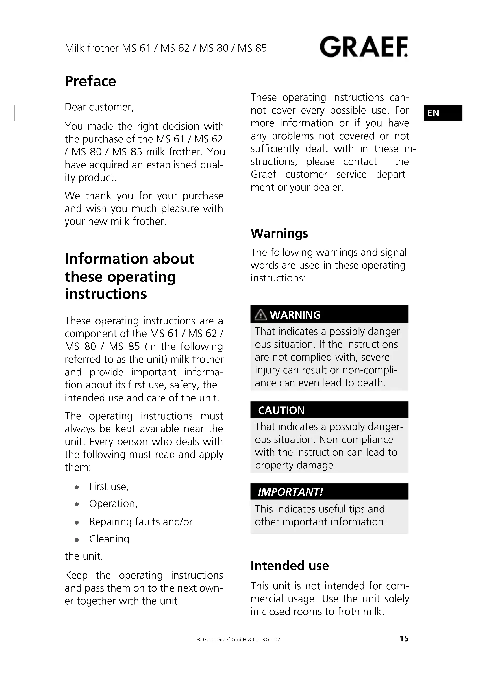Preface Dear customer, You made the right decision with the purchase of the MS 61 / MS 62 / MS 80 / MS 85 milk frother. You have acquired an established qual- ity product. We thank you for your purchase and wish you much pleasure with your new milk frother. Information about these operating instructions These operating instructions are a component of the MS 61 / MS 62 / MS 80 / MS 85 (in the following referred to as the unit) milk frother and provide important informa- tion about its rst use, safety, the intended use and care of the unit. The operating instructions must always be kept available near the unit. Every person who deals with the following must read and apply them: ● First use, ● Operation, ● Repairing faults and/or ● Cleaning the unit. Keep the operating instructions and pass them on to the next own- er together with the unit. These operating instructions can- not cover every possible use. For more information or if you have any problems not covered or not sufciently dealt with in these in- structions, please contact the Graef customer service depart- ment or your dealer. Warnings The following warnings and signal words are used in these operating instructions: WARNING That indicates a possibly danger- ous situation. If the instructions are not complied with, severe injury can result or non-compli- ance can even lead to death. CAUTION That indicates a possibly danger- ous situation. Non-compliance with the instruction can lead to property damage. important! This indicates useful tips and other important information! Intended use This unit is not intended for com- mercial usage. Use the unit solely in closed rooms to froth milk.Milk frother MS 61 / MS 62 / MS 80 / MS 85