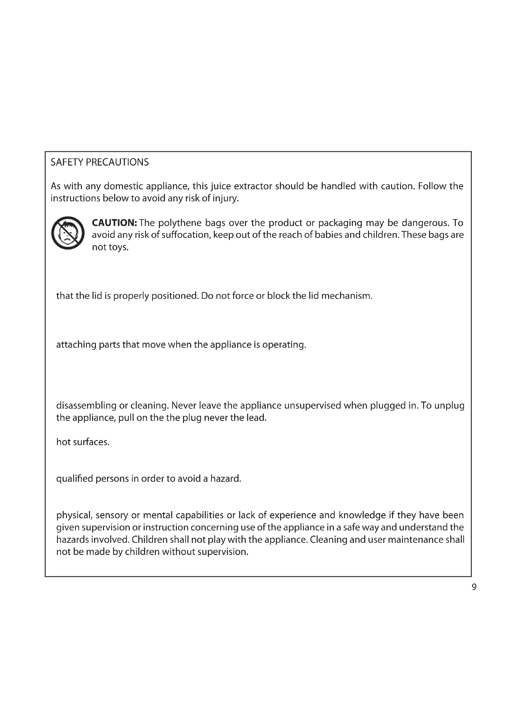 - Assurez-vous que le ltre est bien en place9 SAFETY PRECAUTIONS As with any domestic appliance, this juice extractor should be handled with caution. Follow the instructions below to avoid any risk of injury. CAUTION: The polythene bags over the product or packaging may be dangerous. To avoid any risk of suocation, keep out of the reach of babies and children. These bags are not toys.