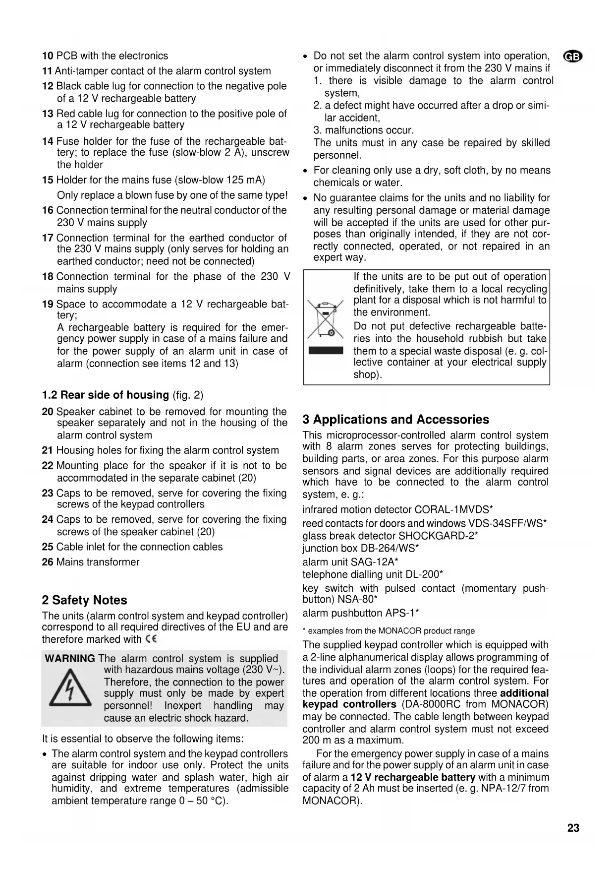 - examples from the MONACOR product range The supplied keypad controller which is equipped with a 2-line alphanumerical display allows programming of the individual alarm zones (loops) for the required fea- tures and operation of the alarm control system. For the operation from different locations three additional keypad controllers (DA-8000RC from MONACOR) may be connected. The cable length between keypad controller and alarm control system must not exceed 200 m as a maximum. For the emergency power supply in case of a mains failure and for the power supply of an alarm unit in case of alarm a 12 V rechargeable battery with a minimum capacity of 2 Ah must be inserted (e. g. NPA-12/7 from MONACOR). If the units are to be put out of operation definitively, take them to a local recycling plant for a disposal which is not harmful to the environment. Do not put defective rechargeable batte- ries into the household rubbish but take them to a special waste disposal (e. g. col- lective container at your electrical supply shop). WARNING The alarm control system is supplied with hazardous mains voltage (230 V~). Therefore, the connection to the power supply must only be made by expert personnel! Inexpert handling may cause an electric shock hazard.