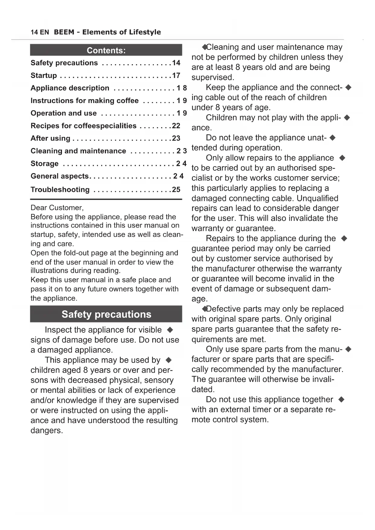 used as described in the section Cleaning and care (page 23). Cleaning and maintenance Before beginning any work, pay attention to the safety instructions in the section Safety instructions (page 14)! Cleaning the appliance Wipe down the housing of the appliance,1. the hotplate and the cup rest with a damp cloth. Use washing-up liquid to remove any stubborn stains. Dry all parts of the appliance thoroughly2. after cleaning. Emptying/cleaning the strainer insert Take the strainer holder (7) with the1. strainer insert (6) out of the appliance as de- scribed in the section Removing the strain- er holder (page 20). Fold up the retaining bracket (14) on the2. handle of the strainer holder (image B1). Hold the strainer insert rmly with the3. folded up retaining bracket and tap the used coffee out of the strainer insert (6) over the waste bin. Remove the strainer insert (6) from the4. strainer holder (7) and rinse the strainer in- sert and strainer holder under running water. Emptying/cleaning the drip tray Remove the cup rest (10).1. Raise the drip tray (9) slightly at the front2. and carefully pull it out of the appliance to the front. Empty the drip tray and rinse out with3. warm water. Clean the cup rest (10) using a damp4. cloth. Install the drip tray and cup rest in the ap-5. pliance again after drying. Cleaning the steam nozzle In order to avoid clogging, the steam nozzle must be cleaned after each use. Pull off the plastic cover of the steam noz-1. zle and rinse the cover by hand or in the dish washer. Point the metal pipe (15) of the appliance2. towards the drip tray and turn the electro switch (4) to the position in order to rinse milk and other residue out of the metal pipe. Wipe down the metal tube with a damp3. cloth. NOTE If the metal tube has become clogged, ► you can clear the clogging with a needle. Descaling the appliance. In order not to shorten the service life of the appliance and impair the quality of the coffee, the appliance must be descaled at regular intervals. The intervals between descaling depend on the water hardness (in the case of hard water after 80 coffees; and soft water after 150 coffees). To descale the appliance, proceed as follows: NOTE ► The appliance switches itself off automatically after 30 minutes. Unplug the appliance and let it cool.2.24 EN BEEM - Elements of Lifestyle Place a fairly large receptacle under the2. strainer holder mounting. Turn the selector switch (4) to the 3. po- sition and allow a third of the descaling solu- tion to run into the receptacle. Turn the selector switch (4) to standby 4. and allow the descaling solution to work for approx. 30 minutes. Turn the selector switch (4) to the5. position and allow the rest of the descaling solution to run through the appliance. Rinse out the water tank thoroughly and6. ush out the appliance by allowing two tank llings of clean water to run through the ap- pliance. Wash all removable parts with warm wa-7. ter and detergent before preparing espresso again. NOTE If you use a commercially available ► descaling agent, observe the manufac- turer's instructions for use. If the appliance is severely scaled, it ► may be necessary to repeat the descaling process. Storage If you do not intend to use the appliance for a longer period of time, clean it as described in the section Cleaning and maintenance (page 23). Store the appliance and all accessory parts at a dry, clean and frost-free location, which is protected against direct sunlight. General aspects Warranty / Guarantee In addition to the statutory warranty obliga- tion, BEEM also grants an extended manu- facturer's guarantee for some products. Provided this is granted, the corresponding details for each product can be found either on the product-specic packaging, advertis- ing material or on the BEEM website. For commercial or equivalent use, e.g. in ho- tels, guest houses or communal premises, or if the customer is not a consumer as dened by the German Civil Code, the guarantee period is 6 months. This does not infringe the warranty disclaimer. Please visit our website to obtain more infor- mation on comprehensive guarantee condi- tions, available accessories and spare parts as well as user manuals in various languages Declaration of Conformity BEEM hereby declares that this appliance complies with the fundamental requirements and other relevant provisions of 2004/108/ EC, 2006/95/EC, 2009/125/EC und 2011/65/ EU directives. Limitation of liability We cannot assume liability for damage or subsequent damage caused by failure to observe the operating instructions, improper use, improper or unsuitable handling, incor- rectly performed repairs, unauthorized modi- cations, use of third-party parts or replace- ment parts, use of unsuitable supplementary or accessory parts. Fill the water tank with water and citric1. acid (5% solution) up to the MAX mark.BEEM - Elements of Lifestyle EN 25 Troubleshooting The following table helps in localising and remedying minor faults. If you cannot resolve the problem with the steps described, please contact customer service. fault Possible cause Remedy The power indicator does not light up after switching on. Not plugged in. Insert the mains plug. Fuse in electrical distribution board switched off. Switch on fuse. The indicator lamp is defec- tive. Contact customer service. The fuse in the distributor box triggers. Too many appliances connect- ed to the same power circuit. Reduce the number of appliances on the power circuit. No fault detected. Contact customer service. Despite pumping noises, no water comes out of the appli- ance No water in the tank. Fill with water Water tank incorrectly in- stalled in the housing Install the water tank properly. Valve on the water tank is clogged If necessary, call cus- tomer service for clean- ing the valve. Water runs out on the under- side of the appliance Drip tray full Empty the drip tray Valve on water tank leaking Contact customer service. The espresso runs into t