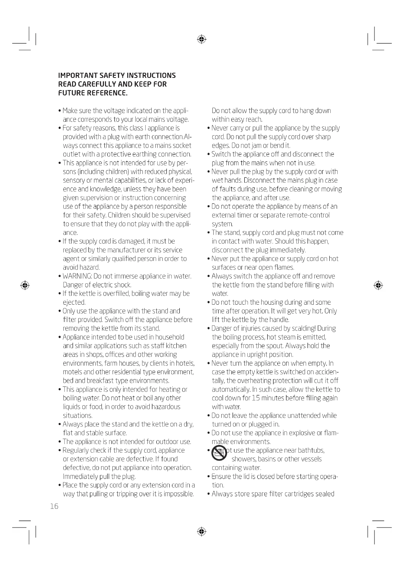 - Only use the appliance with the stand and filter provided. Switch off the appliance before removing the kettle from its stand.