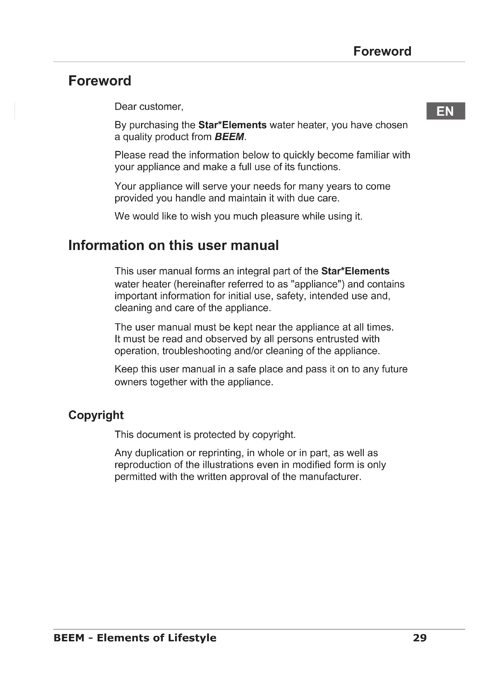 Foreword Dear customer, By purchasing the Star*Elements water heater, you have chosen a quality product from BEEM. Please read the information below to quickly become familiar with your appliance and make a full use of its functions. Your appliance will serve your needs for many years to come provided you handle and maintain it with due care. We would like to wish you much pleasure while using it. Information on this user manual This user manual forms an integral part of the Star*Elements water heater (hereinafter referred to as "appliance") and contains important information for initial use, safety, intended use and, cleaning and care of the appliance. The user manual must be kept near the appliance at all times. It must be read and observed by all persons entrusted with operation, troubleshooting and/or cleaning of the appliance. Keep this user manual in a safe place and pass it on to any future owners together with the appliance. Copyright This document is protected by copyright. Any duplication or reprinting, in whole or in part, as well as reproduction of the illustrations even in modied form is only permitted with the written approval of the manufacturer.30 Information on this user manual BEEM - Elements of Lifestyle