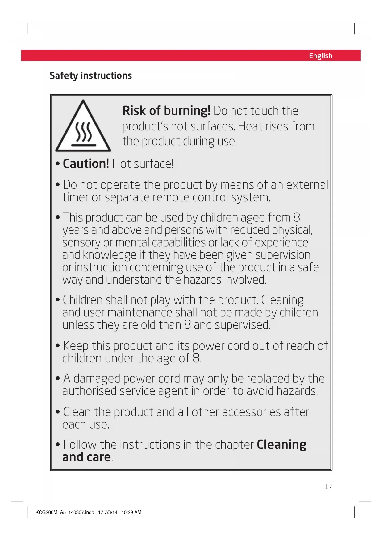 The upper casing will become very hot during operation. Therefore, it is especially important when grilling with the heating plates open to place the product on a fireproof surface. The surface must be level and non-slip.