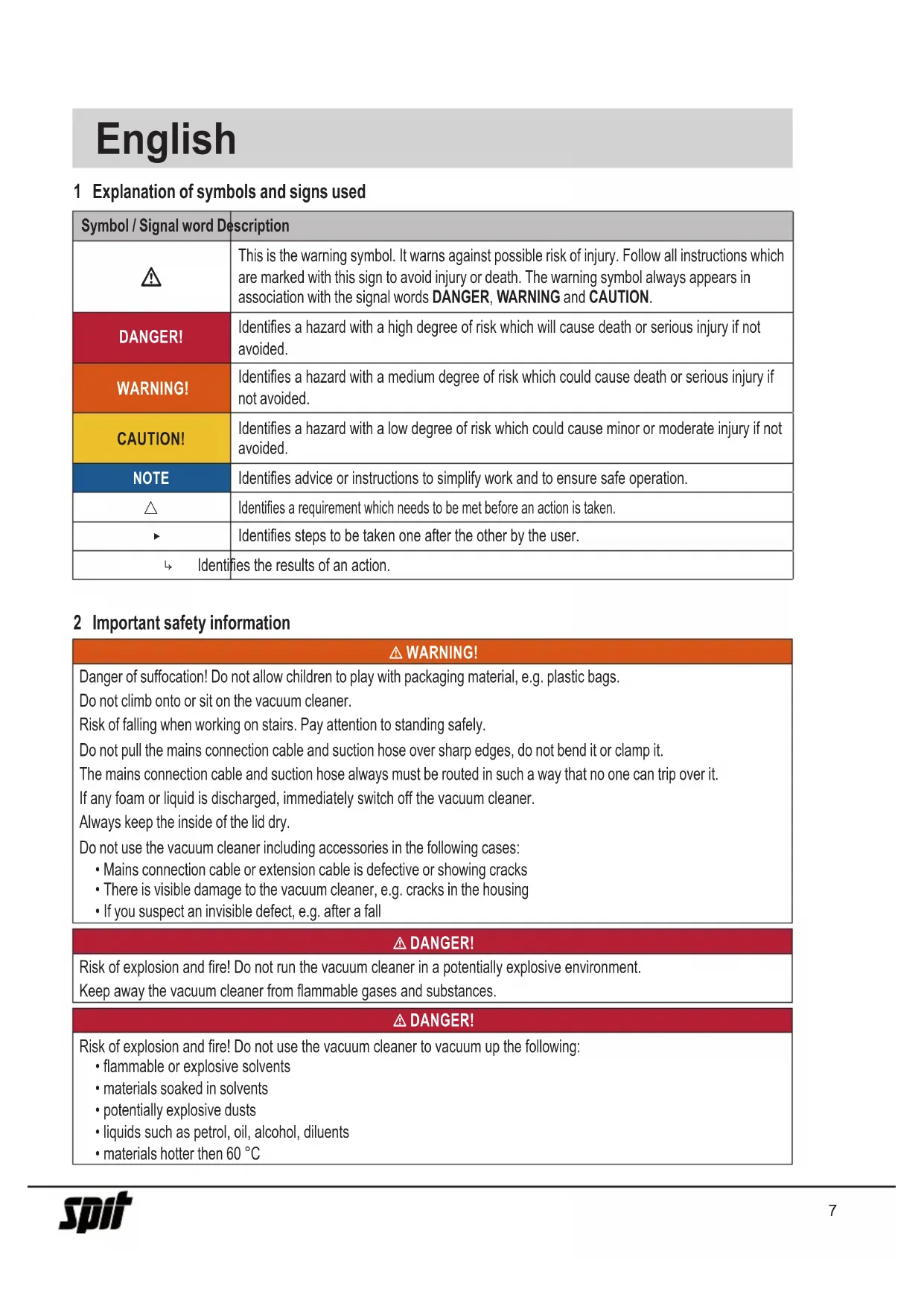 - If you suspect an invisible defect, e.g. after a fall l DANGER! Risk of explosion and re! Do not run the vacuum cleaner in a potentially explosive environment. Keep away the vacuum cleaner from ammable gases and substances. l DANGER! Risk of explosion and re! Do not use the vacuum cleaner to vacuum up the following: