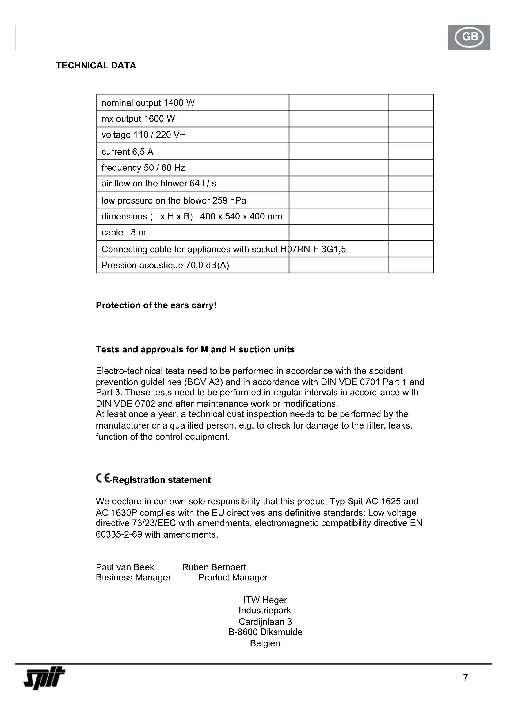 We declare in our own sole responsibility that this product Typ Spit AC 1625 and AC 1630P complies with the EU directives ans definitive standards: Low voltage directive 73/23/EEC with amendments, electromagnetic compatibility directive EN 60335-2-69 with amendments.