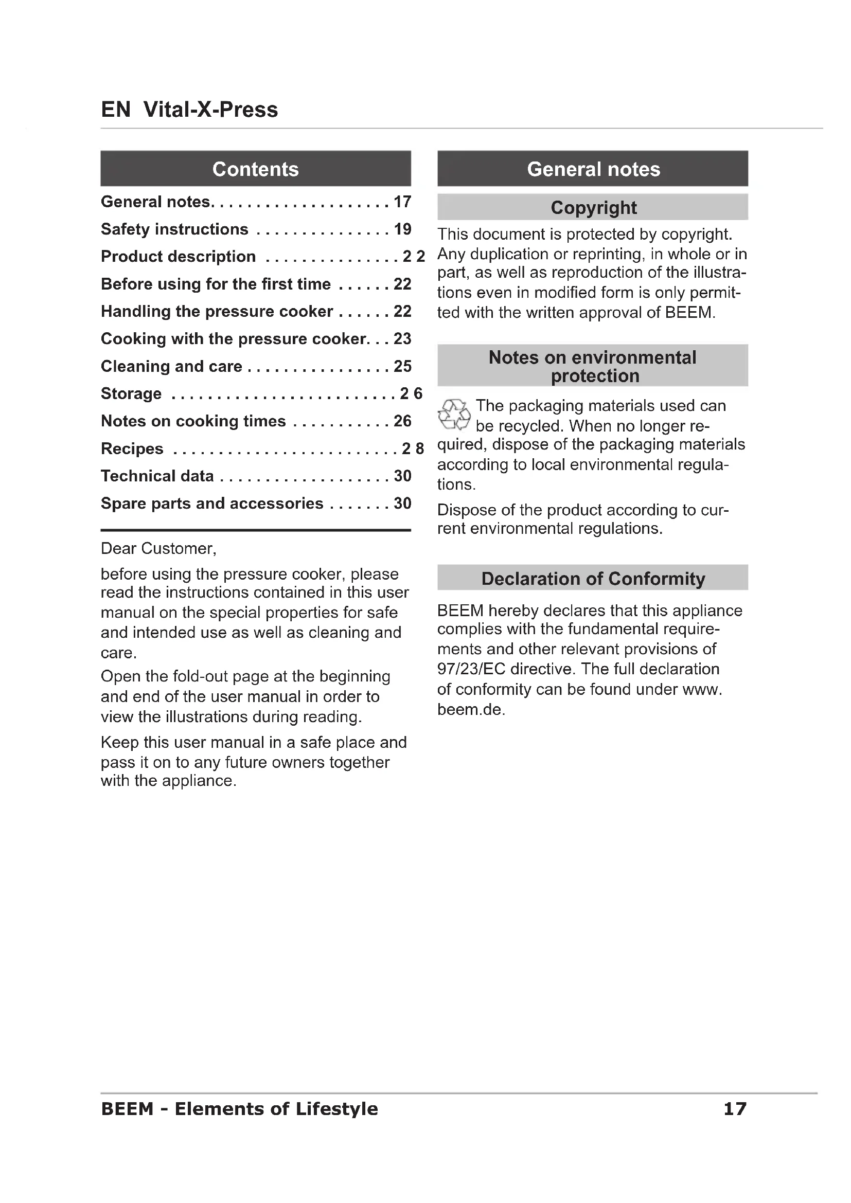 - Nummerierung gemäß Produktbeschreibung17 EN Vital-X-Press BEEM - Elements of Lifestyle Dear Customer, before using the pressure cooker, please read the instructions contained in this user manual on the special properties for safe and intended use as well as cleaning and care. Open the fold-out page at the beginning and end of the user manual in order to view the illustrations during reading. Keep this user manual in a safe place and pass it on to any future owners together with the appliance. General notes Copyright This document is protected by copyright. Any duplication or reprinting, in whole or in part, as well as reproduction of the illustra- tions even in modied form is only permit- ted with the written approval of BEEM. Notes on environmental protection The packaging materials used can be recycled. When no longer re- quired, dispose of the packaging materials according to local environmental regula- tions. Dispose of the product according to cur- rent environmental regulations. Declaration of Conformity BEEM hereby declares that this appliance complies with the fundamental require- ments and other relevant provisions of 97/23/EC directive. The full declaration of conformity can be found under www. beem.de. General notes. . . . . . . . . . . . . . . . . . . . 17 Safety instructions . . . . . . . . . . . . . . . 19 Product description ...............22 Before using for the rst time . . . . . . 22 Handling the pressure cooker . . . . . . 22 Cooking with the pressure cooker. . . 23 Cleaning and care . . . . . . . . . . . . . . . . 25 Storage .........................26 Notes on cooking times . . . . . . . . . . . 26 Recipes .........................28 Technical data . . . . . . . . . . . . . . . . . . . 30 Spare parts and accessories . . . . . . . 30 Contents18 Vital-X-Press EN BEEM - Elements of Lifestyle CAUTION This is used for a possible hazardous situation that could lead to damage. Follow these instructions to avoid ► danger. NOTE A note contains additional informa- ► tion to simplify the use of the appli- ance. Intended use This product is intended for non-commer- cial preparation of food on electric, gas and induction cookers Any use other than previously stated is considered as improper use. WARNING If not used for its intended purpose and/ or used in any other way, the appliance may be or become a source of danger. Use the appliance only for its in- ► tended purpose. Observe the procedures described in ► this user manual. No claims of any kind will be accepted for damage resulting from use of the appli- ance for other than its intended purpose. The risk must be borne solely by the user of the appliance. Warranty/Guarantee In addition to the statutory warranty obliga- tion, BEEM also grants an extended man- ufacturer’s guarantee for some products. Provided this is granted, the correspond- ing details for each product can be found either on the product-specic packaging, advertising material or on the BEEM web- site. Please visit our website to obtain more information on comprehensive guarantee conditions, available accessories and spare parts as well as user manuals in various languages. Symbols used DANGER This indicates a possible hazardous situation, which could lead to severe physical injury or death. Follow these instructions to avoid ► danger. WARNING This is used for a possible hazardous situation that could lead to injury. Follow these instructions to avoid ► danger.19 EN Vital-X-Press BEEM - Elements of Lifestyle Limitation of liability We assume no reliability for damage or follow-up damage in the case of: failure to observe the instructions in ■ the user manual, use for other than the intended pur- ■ pose, improper or unsuitable handling, ■ incorrectly performed repairs, ■ unauthorised modications, ■ use of non-approved parts or spare ■ parts, use of unsuitable supplementary or ac- ■ cessory parts. Safety instructions General safety instructions Read the instructions contained in ► this user manual completely before you work with the pressure cooker. Improper use can lead to considerable damage. Do not allow anyone to use the pres- ► sure cooker before they have made themselves completely familiar with the user manual. Only pass on the pressure cooker to ► a third party together with the user manual. DANGER Risk of suffocation from the packing material! Never play with packaging material. ► Risk of suffocation. Supervision Do not leave the pressure cooker unat- ► tended during use. Do not use the pressure cooker in the ► vicinity of children. This pressure cooker is not intended ► for use by persons (including children) with restricted physical, sensory or mental capabilities or with insufcient experience and/or knowledge un- less they are supervised by a person responsibly for their safety or have received instructions on the use of the appliance from such a person. Safe use WARNING Observe the following notes to avoid injury: The pressure cooker cooks under ► pressure. Before heating, check that the lid is seated properly as described in the section Closing the lid (page 23). Never use the pres- sure cooker with a loosely tting lid. Check that the safety valve and the ► regulating valve are clean and func- tional before using each time (see the section Check the safety valve (page 23) and inspect the pressure cooker for external damage before using. Doe not use a damaged pres- sure cooker.20 Vital-X-Press EN BEEM - Elements of Lifestyle WARNING Observe the following notes to avoid injury: Always fry in the pressure cooker ► without the lid in order to prevent the fat from frothing. Do not ll the pres- sure cooker more than a half with fat. Never fry under pressure. WARNING Observe the following instructions to avoid burning/scalding: Only hold the pressure cooker with ► the handle and operating elements. If necessary, use gloves or pot hold- ers. Move the pressure cooker carefully ► when it is under pressure.