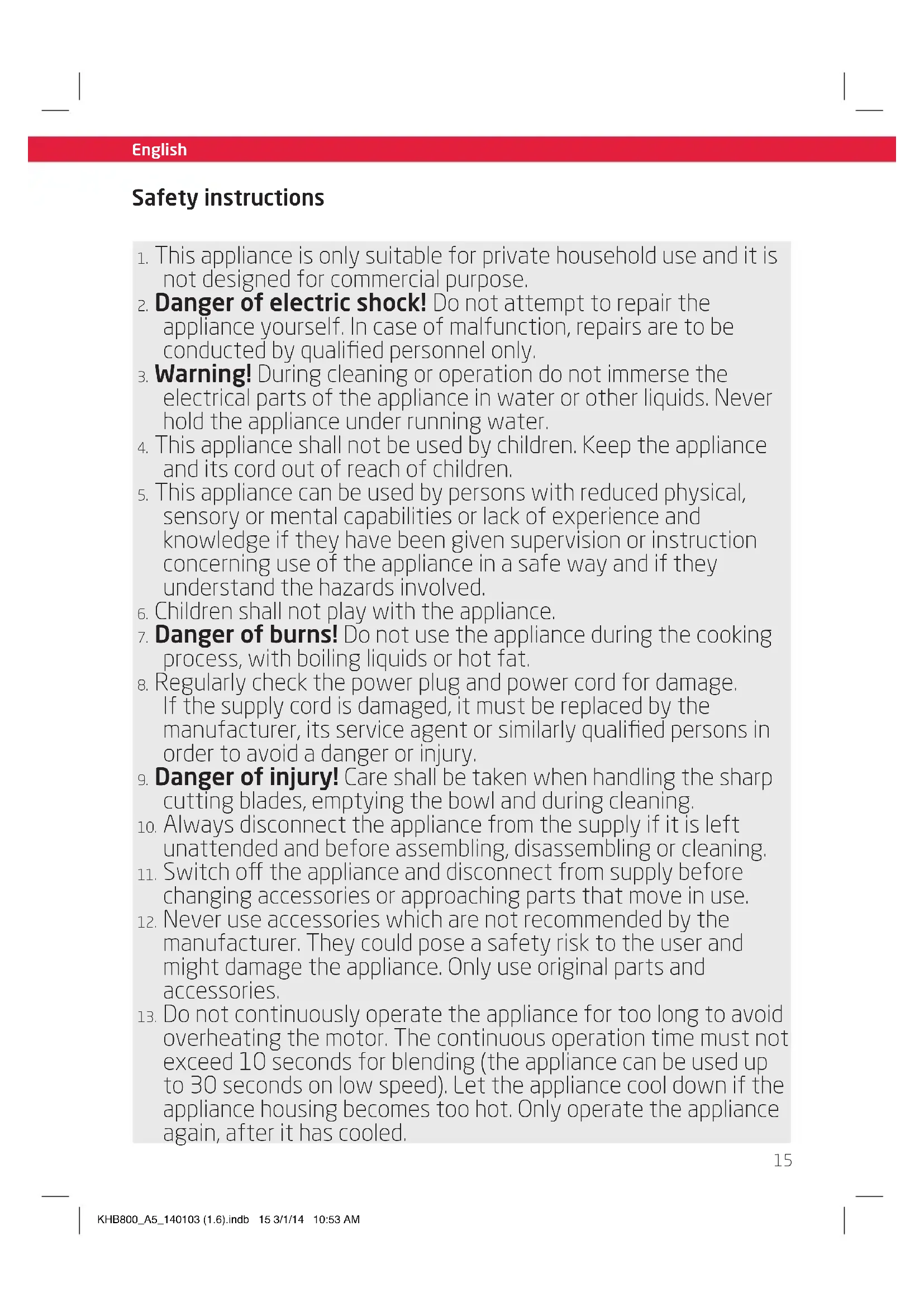 overheating the motor. The continuous operation time must not exceed 10 seconds for blending (the appliance can be used up to 30 seconds on low speed). Let the appliance cool down if the appliance housing becomes too hot. Only operate the appliance again, after it has cooled. KHB800_A5_140103 (1.6).indb 15 3/1/14 10:53 AM16 English English Safety instructions