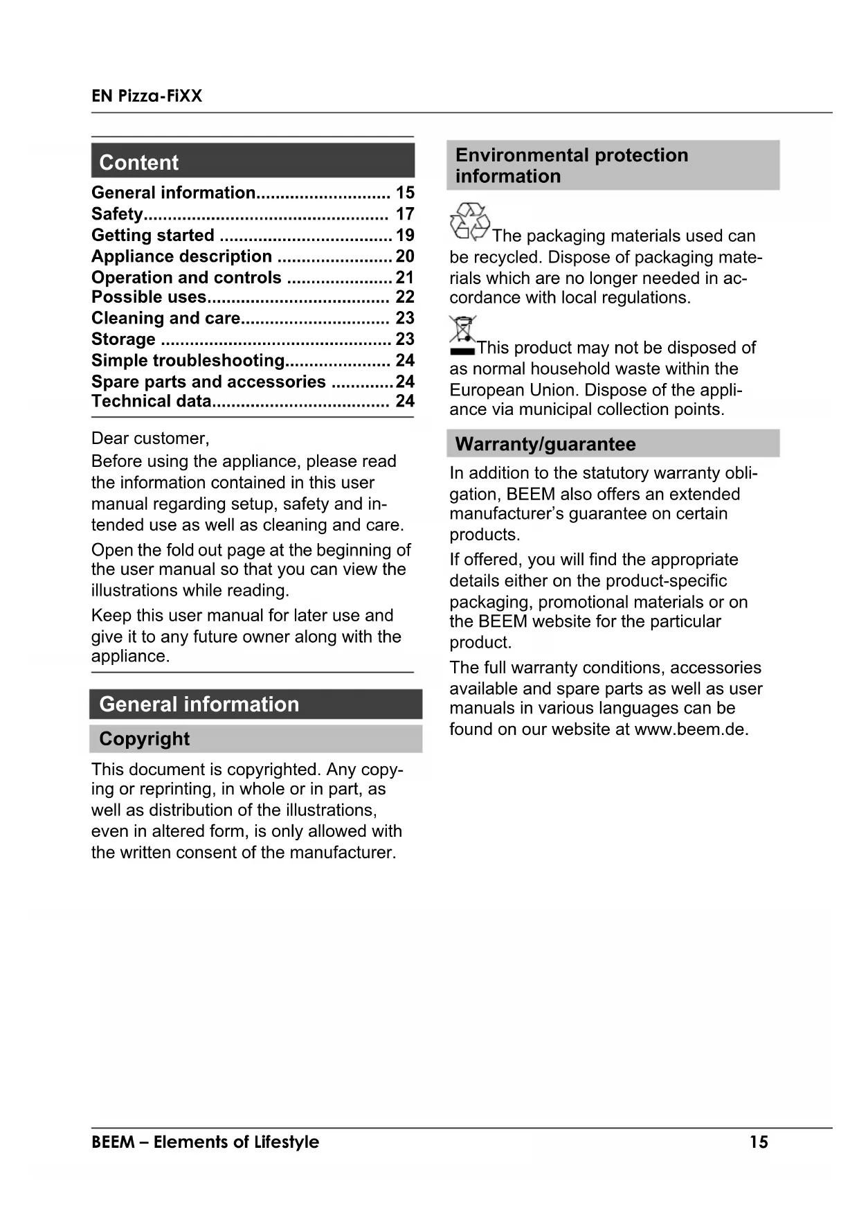Dear customer, Before using the appliance, please read the information contained in this user manual regarding setup, safety and in- tended use as well as cleaning and care. Open the fold out page at the beginning of the user manual so that you can view the illustrations while reading. Keep this user manual for later use and give it to any future owner along with the appliance. General information Copyright This document is copyrighted. Any copy- ing or reprinting, in whole or in part, as well as distribution of the illustrations, even in altered form, is only allowed with the written consent of the manufacturer. Environmental protection information The packaging materials used can be recycled. Dispose of packaging mate- rials which are no longer needed in ac- cordance with local regulations. This product may not be disposed of as normal household waste within the European Union. Dispose of the appli- ance via municipal collection points. Warranty/guarantee In addition to the statutory warranty obli- gation, BEEM also offers an extended manufacturer’s guarantee on certain products. If offered, you will find the appropriate details either on the product-specific packaging, promotional materials or on the BEEM website for the particular product. The full warranty conditions, accessories available and spare parts as well as user manuals in various languages can be found on our website at www.beem.de.Pizza-FiXX EN 16 BEEM – Elements of Lifestyle Symbols used DANGER This is used for a hazard which is an immediate threat leading to severe bodily injury or to death. To avoid the hazard, follow the in- structions given here. WARNING This is used for a possibly hazardous situation which could lead to severe bod- ily injury or to death. To avoid the hazard, follow the in- structions given here. CAUTION This is used for a possibly hazardous situation which could lead to minor inju- ries. To avoid the hazard, follow the in- structions given here. ATTENTION This is used for a situation which could lead to material damage. To avoid the hazard, follow the in- structions given here. Limitation of liability We assume no liability for damage or consequential damage caused by: