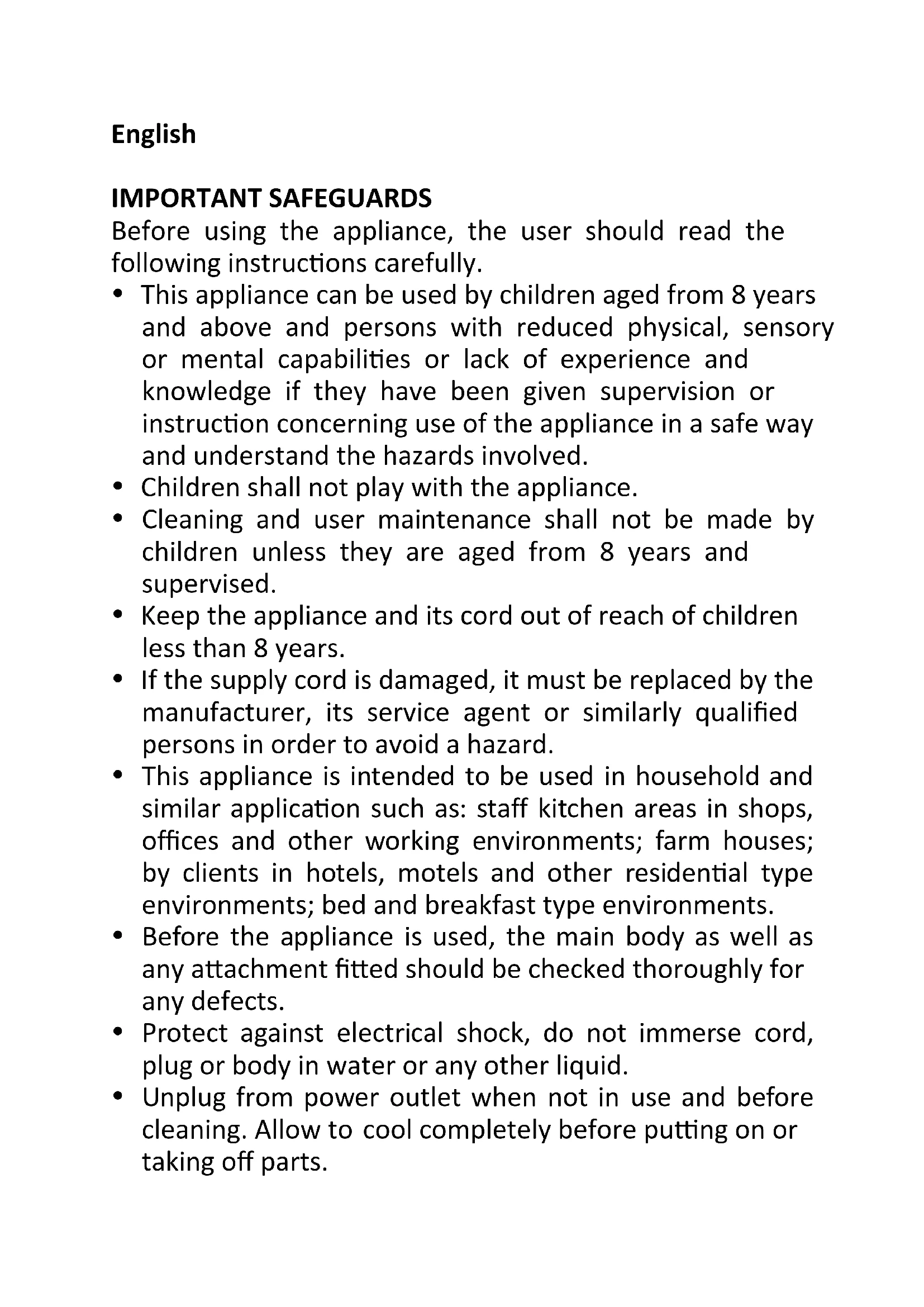 TECHNICAL DATA Operating voltage: 220-240V ~ 50Hz Power consumption: 1200WGUARANTEE AND CUSTOMER SERVICE Before delivery our devices are subjected to rigorous quality control. If, despite all care, damage has occurred during production or transportation, please return the device to your dealer. In addition to statutory legal rights, the purchaser has an option to claim under the terms of the following guarantee: For the purchased device we provide 2 years guarantee, commencing from the day of sale. If you have a defective product, you can directly go back to the point of purchase. Defects which arise due to improper handling of the device and malfunctions due to interventions and repairs by third parties or the fitting of non-original parts are not covered by this guarantee. Always keep your receipt, without the receipt you can’t claim any form of warranty. Damage caused by not following the instruction manual, will lead to a void of warranty, if this results in consequential damages then we will not be liable. Neither can we hold responsible for material damage or personal injury caused by improper use if the instruction manual is not properly executed. Damage to accessories does not mean free replacement of the whole appliance. In such case please contact our service department. Broken glass or breakage of plastic parts is always subject to a charge. Defects to consumables or parts subjected to wearing, as well as cleaning, maintenance or the replacement of said parts are not covered by the warranty and are to be paid.