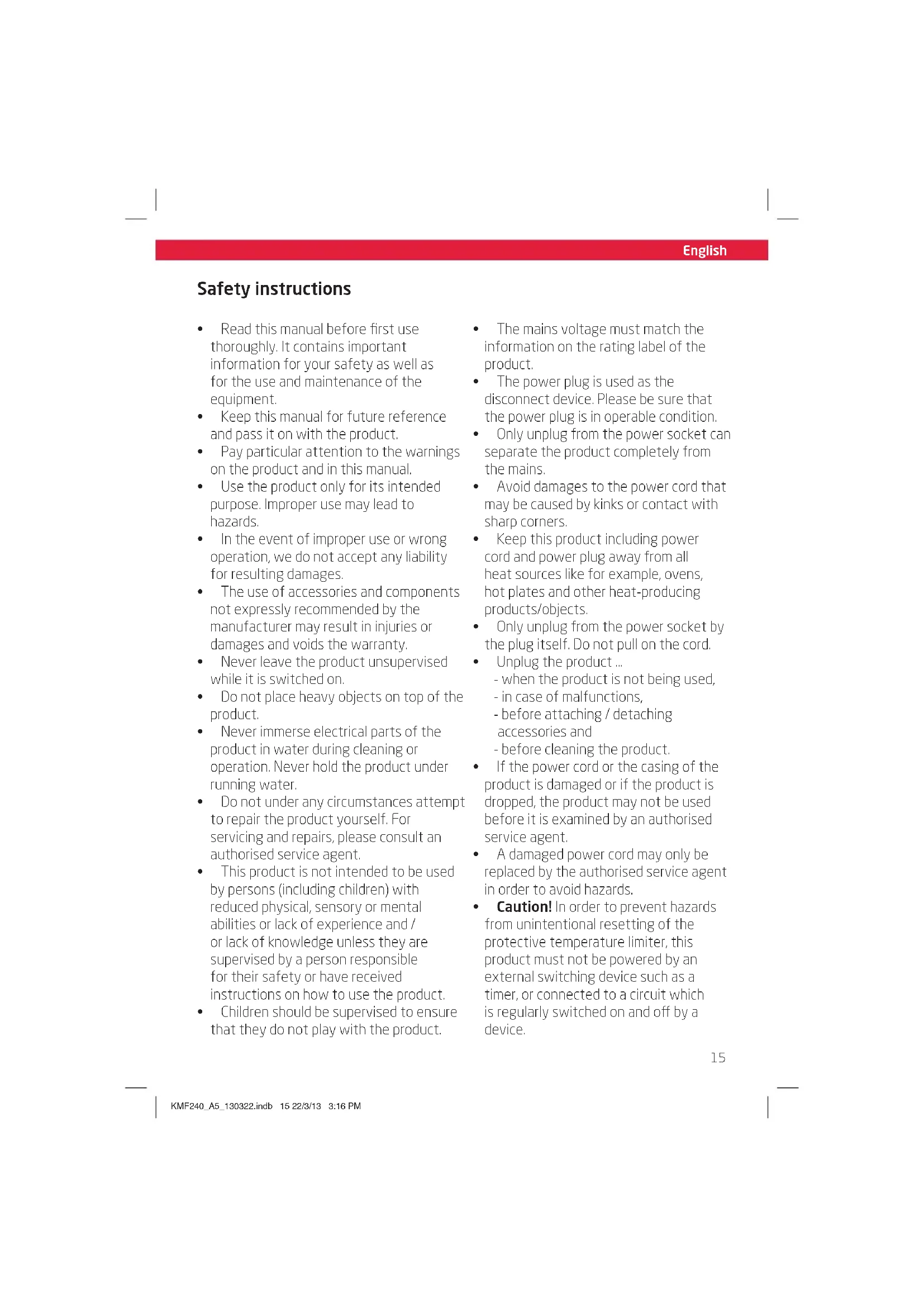 Safety instructions Œ Read this manual before first use thoroughly. It contains important information for your safety as well as for the use and maintenance of the equipment. Œ Keep this manual for future reference and pass it on with the product. Œ Pay particular attention to the warnings on the product and in this manual. Œ Use the product only for its intended purpose. Improper use may lead to hazards. Œ In the event of improper use or wrong operation, we do not accept any liability for resulting damages. Œ The use of accessories and components not expressly recommended by the manufacturer may result in injuries or damages and voids the warranty. Œ Never leave the product unsupervised while it is switched on. Œ Do not place heavy objects on top of the product. Œ Never immerse electrical parts of the product in water during cleaning or operation. Never hold the product under running water. Œ Do not under any circumstances attempt to repair the product yourself. For servicing and repairs, please consult an authorised service agent. Œ This product is not intended to be used by persons (including children) with reduced physical, sensory or mental abilities or lack of experience and / or lack of knowledge unless they are supervised by a person responsible for their safety or have received instructions on how to use the product. Œ Children should be supervised to ensure that they do not play with the product. Œ The mains voltage must match the information on the rating label of the product. Œ The power plug is used as the disconnect device. Please be sure that the power plug is in operable condition. Œ Only unplug from the power socket can separate the product completely from the mains. Œ Avoid damages to the power cord that may be caused by kinks or contact with sharp corners. Œ Keep this product including power cord and power plug away from all heat sources like for example, ovens, hot plates and other heat-producing products/objects. Œ Only unplug from the power socket by the plug itself. Do not pull on the cord. Œ Unplug the product ... - when the product is not being used, - in case of malfunctions, - before attaching / detaching accessories and - before cleaning the product. Œ If the power cord or the casing of the product is damaged or if the product is dropped, the product may not be used before it is examined by an authorised service agent. Œ A damaged power cord may only be replaced by the authorised service agent in order to avoid hazards. Œ Caution! In order to prevent hazards from unintentional resetting of the protective temperature limiter, this product must not be powered by an external switching device such as a timer, or connected to a circuit which is regularly switched on and o by a device. KMF240_A5_130322.indb 15 22/3/13 3:16 PMEnglish