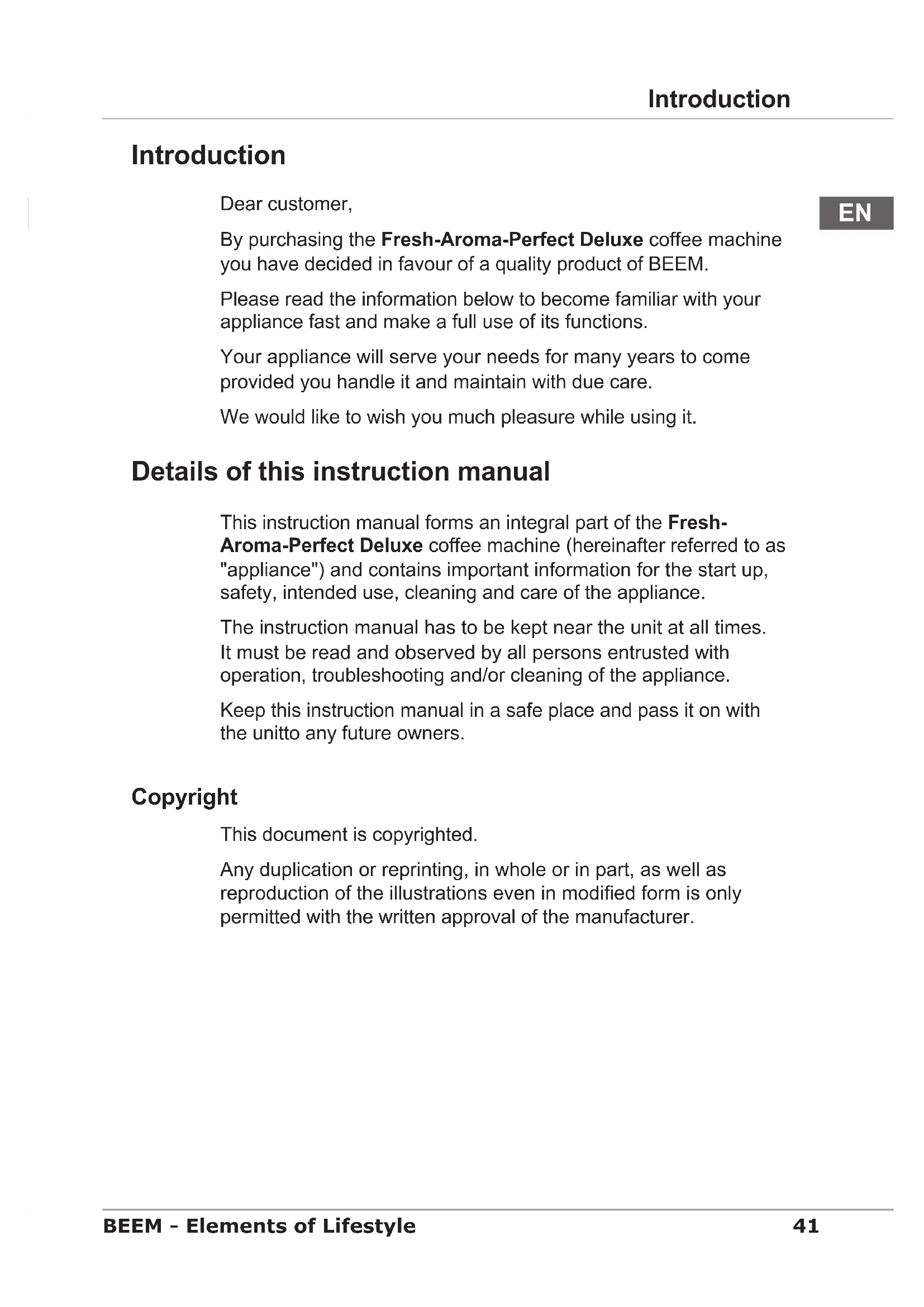 Introduction Dear customer, By purchasing the Fresh-Aroma-Perfect Deluxe coffee machine you have decided in favour of a quality product of BEEM. Please read the information below to become familiar with your appliance fast and make a full use of its functions. Your appliance will serve your needs for many years to come provided you handle it and maintain with due care. We would like to wish you much pleasure while using it. Details of this instruction manual This instruction manual forms an integral part of the Fresh- Aroma-Perfect Deluxe coffee machine (hereinafter referred to as "appliance") and contains important information for the start up, safety, intended use, cleaning and care of the appliance. The instruction manual has to be kept near the unit at all times. It must be read and observed by all persons entrusted with operation, troubleshooting and/or cleaning of the appliance. Keep this instruction manual in a safe place and pass it on with the unitto any future owners. Copyright This document is copyrighted. Any duplication or reprinting, in whole or in part, as well as reproduction of the illustrations even in modied form is only permitted with the written approval of the manufacturer.42 Details of this instruction manual BEEM - Elements of Lifestyle