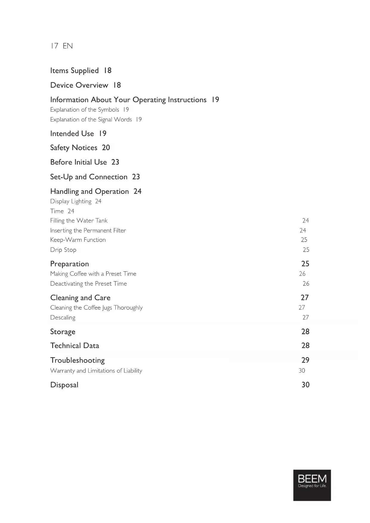 - Operating instructions Check the items supplied for completeness and transport damage. If you fi nd any damage to the device or the connection, do not use the device (!), but contact our customer service department. Device Overview Key (See fold-out page for illustrations) 1 Water tank lid 2 Permanent fi lter 3 Filter compartment 4 Anti-drip valve in the coffee outlet of the fi lter compartment 5 Glass jug 6 Hotplate 7 Control panel with display and control lamps 8 Water level indicator 9 Water tank Control panel 10 PROG button (programming the time / preset time) 11 Operating lamp, red 12 MIN button (setting the minutes) 13 ON / OFF button (On / Off switch) 14 HR button (setting the hours) 15 Preset time control lamp, green 16 AUTO button (activate / deactivate the preset time)19 EN Congratulations! Dear Customer, We are delighted that you have chosen this fi lter coffee machine. If you have any questions about our device and about spare parts/accessories, contact the customer service department via our website: www.beem.de Information About Your Operating Instructions Before using the device for the fi rst time, please read the operating instructions carefully and keep them for future reference. If the device is given to someone else, these operating instructions should also be handed over with it. The manufacturer and importer do not accept any liability if the information in these operating instructions is not complied with. Explanation of the Symbols Danger symbols: These symbols indicate a risk of injury. Read through the associated safety instructions carefully and follow them to prevent personal injury. Supplementary information Suitable for food use. Beware of hot surfaces! Read operating instructions before use! Explanation of the Signal Words DANGER Warns of serious injuries and danger to life. WARNING Warns of possible serious injuries and danger to life. CAUTION Warns of slight to moderate injuries. NOTICE Warns of damage to property. Intended Use