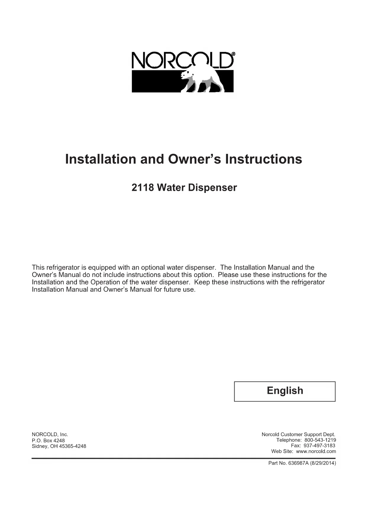 - NORCOLD, Inc. P.O. Box 4248 Sidney, OH 45365-4248 Part No. 636987A (8/29/2014) English Norcold Customer Support Dept. Telephone: 800-543-1219 Fax: 937-497-3183 Web Site: www.norcold.com Installation and Owner’s Instructions 2118 Water Dispenser This refrigerator is equipped with an optional water dispenser. The Installation Manual and the Owner’s Manual do not include instructions about this option. Please use these instructions for the Installation and the Operation of the water dispenser. Keep these instructions with the refrigerator Installation Manual and Owner’s Manual for future use.Installation and Owner’s Manual 2 Water Dispenser The water dispenser is assembled to the refrigerators at the factory as optional equipment. If the refrigerator does not have a factory installed water dispenser, one cannot be added to the refrigerator at a later time. The water dispenser has a water reservoir that is built into the bottom of the refrigerator fresh food compartment. As water is dispensed, the reservoir automatically rells with water. The reservoir allows the supply water to cool to the same temperature as the inside of the refrigerator fresh food compartment. Most vehicle manufacturers have a water lter installed in the plumbing system to remove odor, taste, chlorine, and sediment from the water. If the vehicle does not already have a water lter installed, Norcold recommends that you install one before operating the water dispenser. Contact your dealer. The water dispenser operates only on demand and will operate in ambient temperatures as low as 0° F. To allow operation at temperatures between 0° F and 32° F., the water dispenser has a heater on the solenoid water valves and on the water line between the solenoid valves and the water dispenser. At temperatures below 0° F, store the water dispenser as written in the “Water Dispenser Storage” section of these instructions. The water line heater does not protect the water supply line from the vehicle shut off valve to the solenoid valves on the back of the refrigerator. Do not allow the temperature inside the refrigerator fresh food compartment to be less than 32° F. At this temperature, the water inside the reservoir will freeze and damage the reservoir. If the vehicle is to shut down during cold weather, store the water dispenser as written in the “Water Dispenser Storage” section of these instructions. Owner’s Instructions Table of Contents Owner’s Instructions p. 2