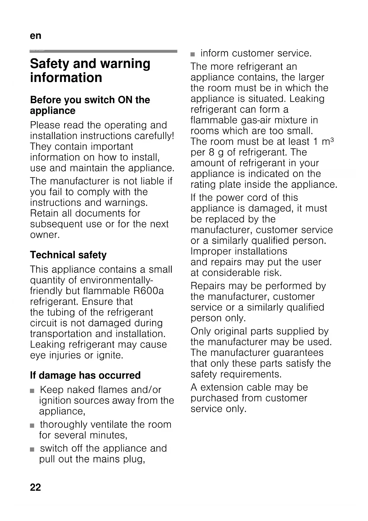 enTable of Contents enInstruction for Use Safety and warning information Before you switch ON the appliance Please read the operating and installation instructions carefully! They contain important information on how to install, use and maintain the appliance. The manufacturer is not liable if you fail to comply with the instructions and warnings. Retain all documents for subsequent use or for the next owner. Technical safety This appliance contains a small quantity of environmentally- friendly but flammable R600a refrigerant. Ensure that the tubing of the refrigerant circuit is not damaged during transportation and installation. Leaking refrigerant may cause eye injuries or ignite. If damage has occurred ■ Keep naked flames and/or ignition sources away from the appliance, ■ thoroughly ventilate the room for several minutes, ■ switch off the appliance and pull out the mains plug, ■ inform customer service. The more refrigerant an appliance contains, the larger the room must be in which the appliance is situated. Leaking refrigerant can form a flammable gas-air mixture in rooms which are too small. The room must be at least 1 m³ per 8 g of refrigerant. The amount of refrigerant in your appliance is indicated on the rating plate inside the appliance. If the power cord of this appliance is damaged, it must be replaced by the manufacturer, customer service or a similarly qualified person. Improper installations and repairs may put the user at considerable risk. Repairs may be performed by the manufacturer, customer service or a similarly qualified person only. Only original parts supplied by the manufacturer may be used. The manufacturer guarantees that only these parts satisfy the safety requirements. A extension cable may be purchased from customer service only.en
