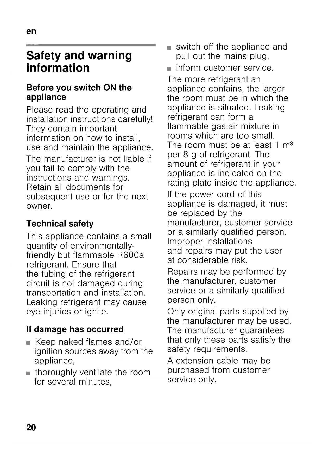 enTable of Contents enInstruction for Use Safety and warning information Before you switch ON the appliance Please read the operating and installation instructions carefully! They contain important information on how to install, use and maintain the appliance. The manufacturer is not liable if you fail to comply with the instructions and warnings. Retain all documents for subsequent use or for the next owner. Technical safety This appliance contains a small quantity of environmentally- friendly but flammable R600a refrigerant. Ensure that the tubing of the refrigerant circuit is not damaged during transportation and installation. Leaking refrigerant may cause eye injuries or ignite. If damage has occurred ■ Keep naked flames and/or ignition sources away from the appliance, ■ thoroughly ventilate the room for several minutes, ■ switch off the appliance and pull out the mains plug, ■ inform customer service. The more refrigerant an appliance contains, the larger the room must be in which the appliance is situated. Leaking refrigerant can form a flammable gas-air mixture in rooms which are too small. The room must be at least 1 m³ per 8 g of refrigerant. The amount of refrigerant in your appliance is indicated on the rating plate inside the appliance. If the power cord of this appliance is damaged, it must be replaced by the manufacturer, customer service or a similarly qualified person. Improper installations and repairs may put the user at considerable risk. Repairs may be performed by the manufacturer, customer service or a similarly qualified person only. Only original parts supplied by the manufacturer may be used. The manufacturer guarantees that only these parts satisfy the safety requirements. A extension cable may be purchased from customer service only.en