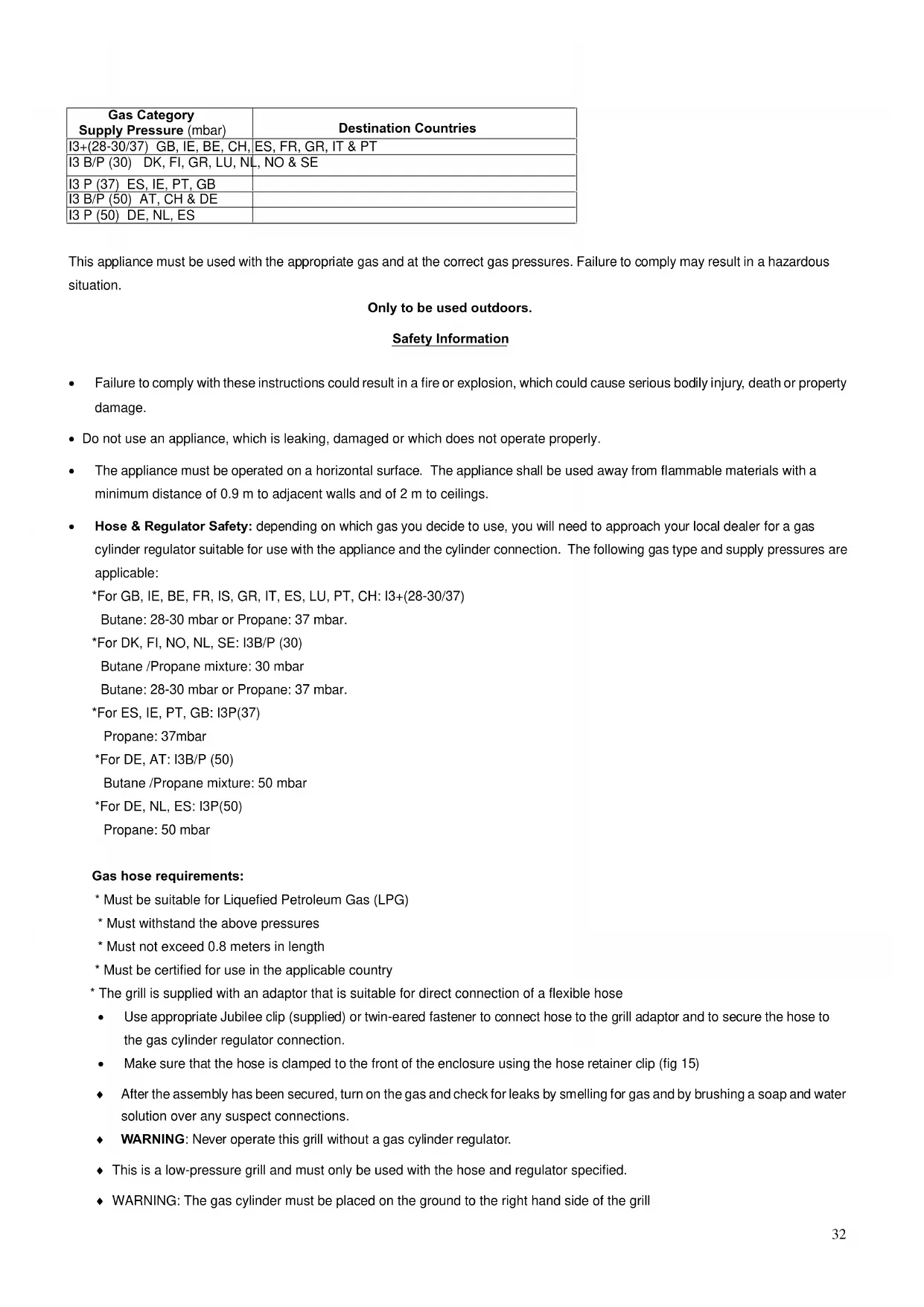 - Hose & Regulator Safety: depending on which gas you decide to use, you will need to approach your local dealer for a gas cylinder regulator suitable for use with the appliance and the cylinder connection. The following gas type and supply pressures are applicable: