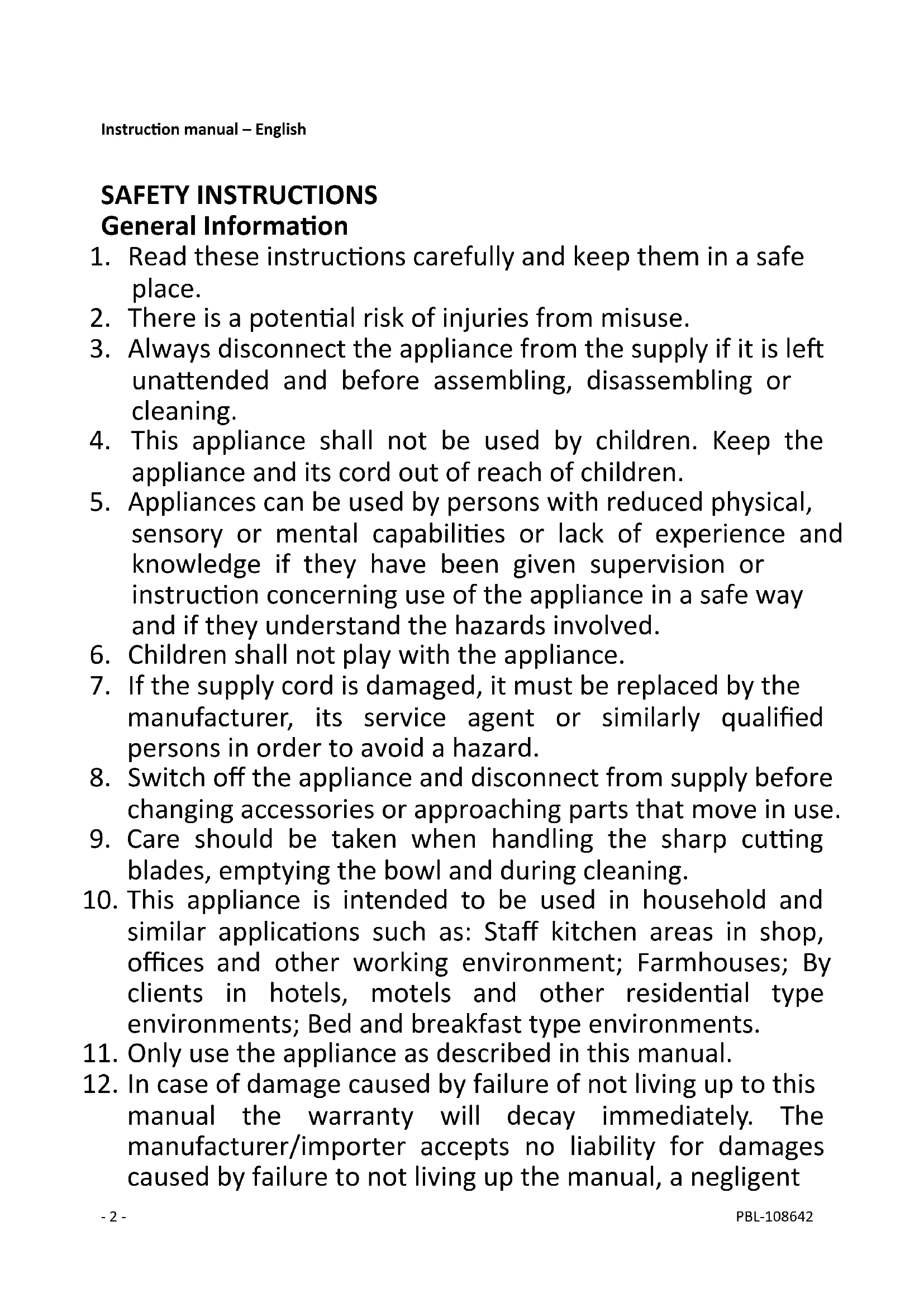 Before delivery our devices are subjected to rigorous quality control. If, despite all care, damage has occurred during production or transportation, please return the device to your dealer. In addition to statutory legal rights, the purchaser has an option to claim under the terms of the following guarantee: For the purchased device we provide 2 years guarantee, commencing from the day of sale. If you have a defective product, you can directly go back to the point of purchase.- 12 - PBL-108642 Defects which arise due to improper handling of the device and malfunctions due to interventions and repairs by third parties or the fitting of non-original parts are not covered by this guarantee. Always keep your receipt, without the receipt you can’t claim any form of warranty. Damage caused by not following the instruction manual, will lead to a void of warranty, if this results in consequential damages then we will not be liable. Neither can we hold responsible for material damage or personal injury caused by improper use if the instruction manual is not properly executed. Damage to accessories does not mean free replacement of the whole appliance. In such case please contact our service department. Broken glass or breakage of plastic parts is always subject to a charge. Defects to consumables or parts subjected to wearing, as well as cleaning, maintenance or the replacement of said parts are not covered by the warranty and are to be paid.