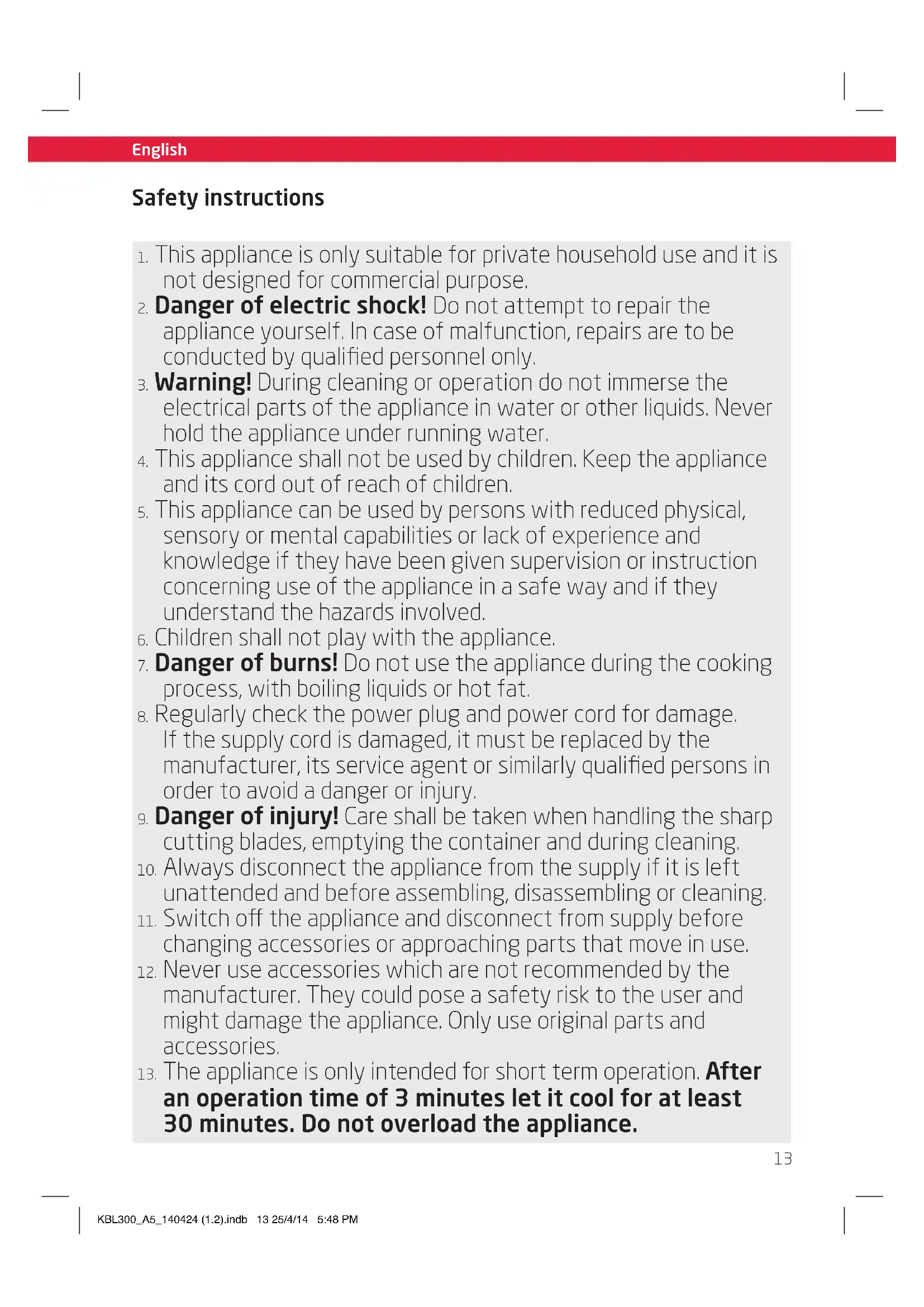 During operation keep hands, hair, clothing and utensils away from the cutting blades to avoid injuries and damage of the appliance.
