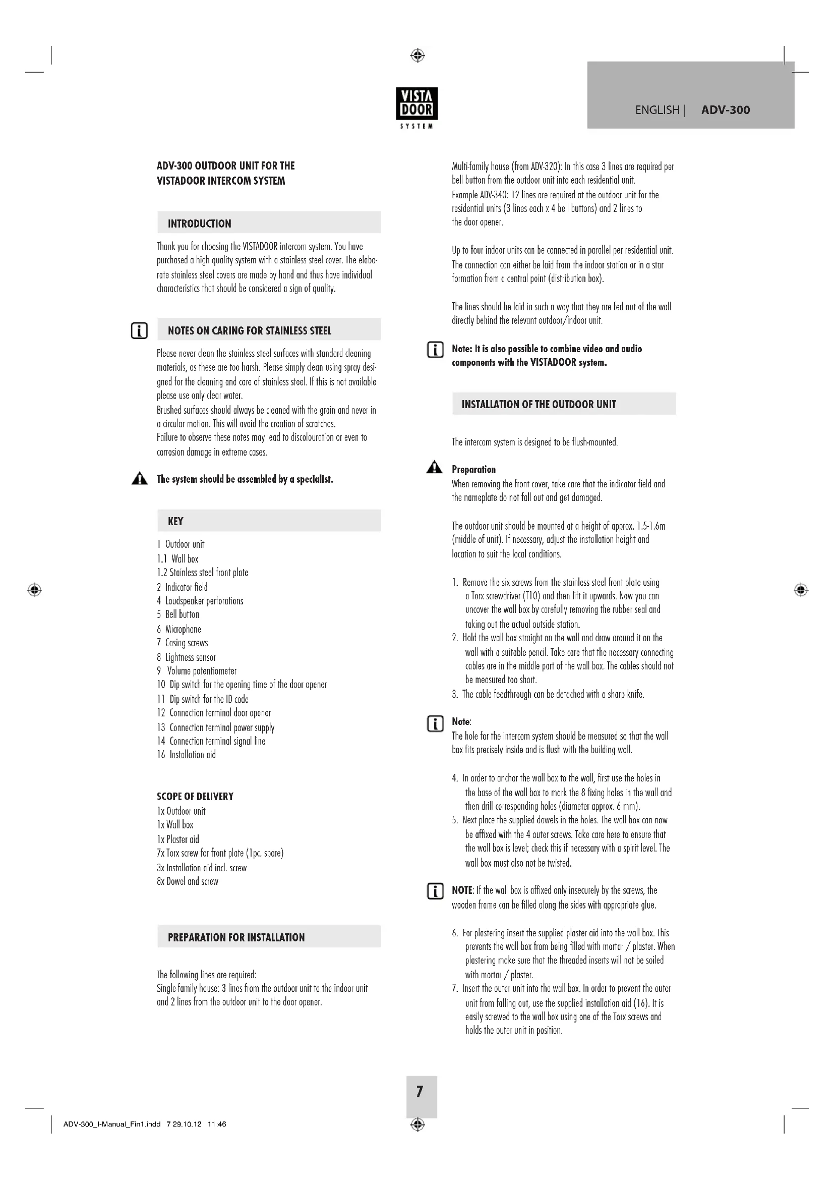 Thank you for choosing the VISTADOOR intercom system. You have purchased a high quality system with a stainless steel cover. The elaborate stainless steel covers are made by hand and thus have individual characteristics that should be considered a sign of quality.