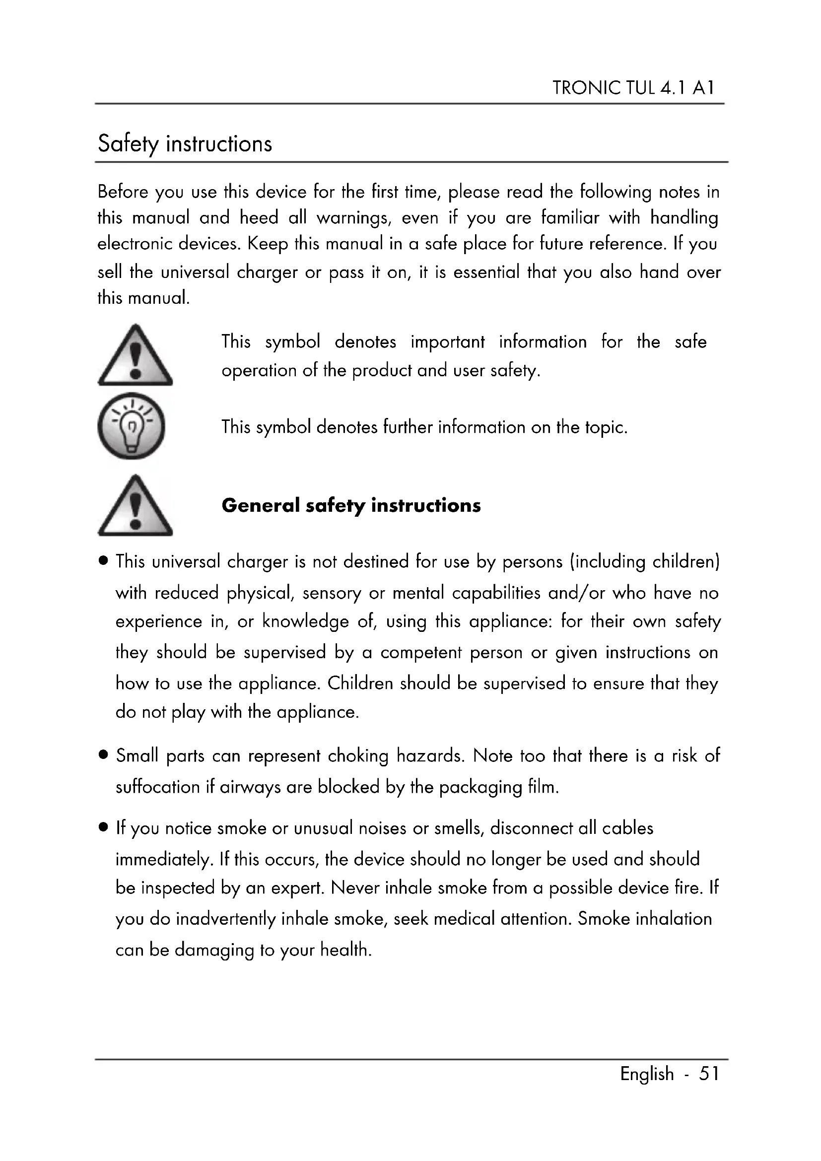 Frequency: 50/60Hz Nominal current: 0.3A Output voltage: 12V Output current: 0.7A Degree of protection: IITRONIC TUL 4.1 A1 English - 51 Safety instructions Before you use this device for the first time, please read the following notes in this manual and heed all warnings, even if you are familiar with handling electronic devices. Keep this manual in a safe place for future reference. If you sell the universal charger or pass it on, it is essential that you also hand over this manual. This symbol denotes important information for the safe operation of the product and user safety. This symbol denotes further information on the topic. General safety instructions This universal charger is not destined for use by persons (including children) with reduced physical, sensory or mental capabilities and/or who have no experience in, or knowledge of, using this appliance: for their own safety they should be supervised by a competent person or given instructions on how to use the appliance. Children should be supervised to ensure that they do not play with the appliance. Small parts can represent choking hazards. Note too that there is a risk of suffocation if airways are blocked by the packaging film. If you notice smoke or unusual noises or smells, disconnect all cables immediately. If this occurs, the device should no longer be used and should be inspected by an expert. Never inhale smoke from a possible device fire. If you do inadvertently inhale smoke, seek medical attention. Smoke inhalation can be damaging to your health.TRONIC TUL 4.1 A1
