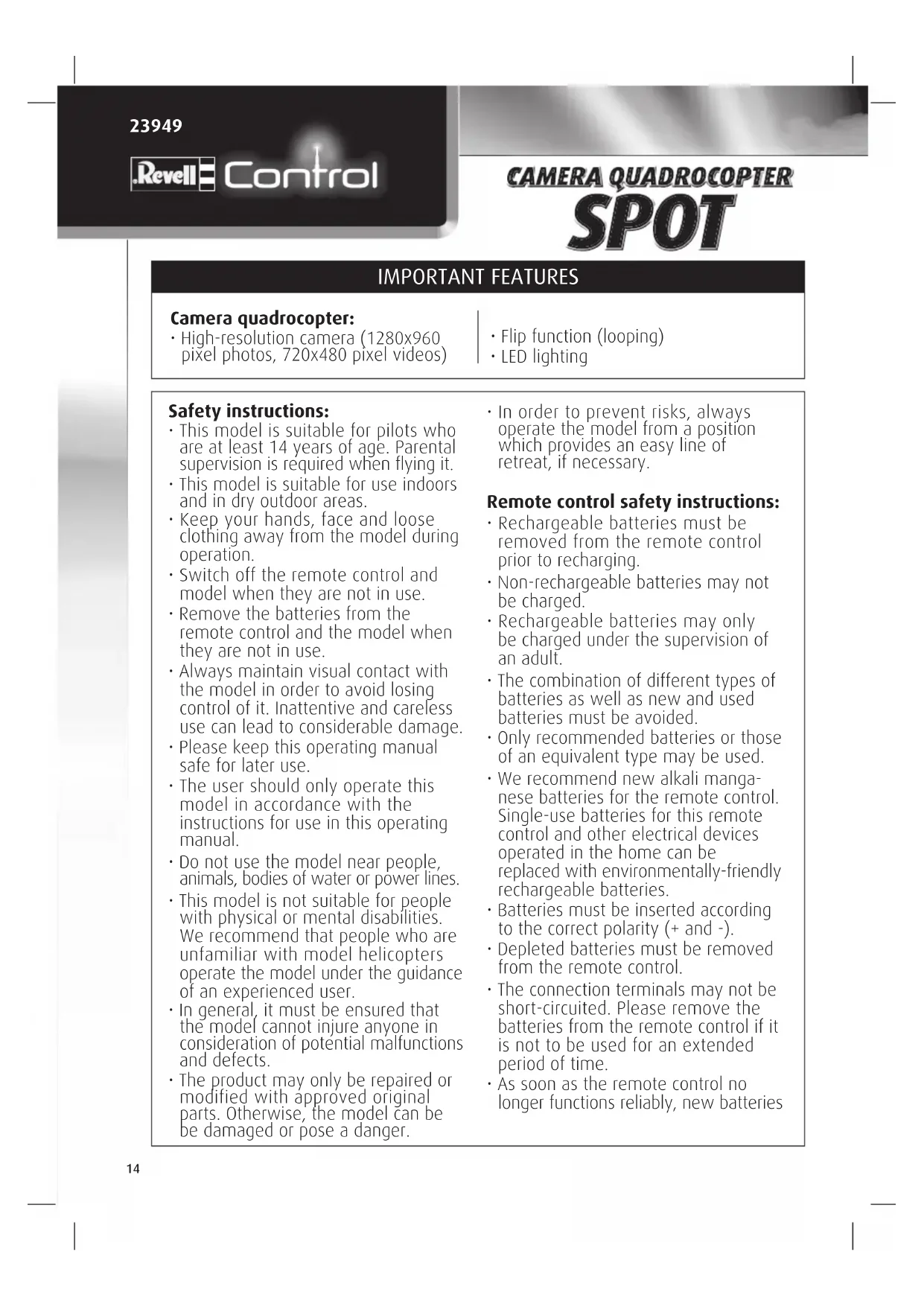 Download the instructions for your Drone in PDF format for free! Find your manual Spot - Revell and take your electronic device back in hand. On this page are published all the documents necessary for the use of your device. Spot by Revell.