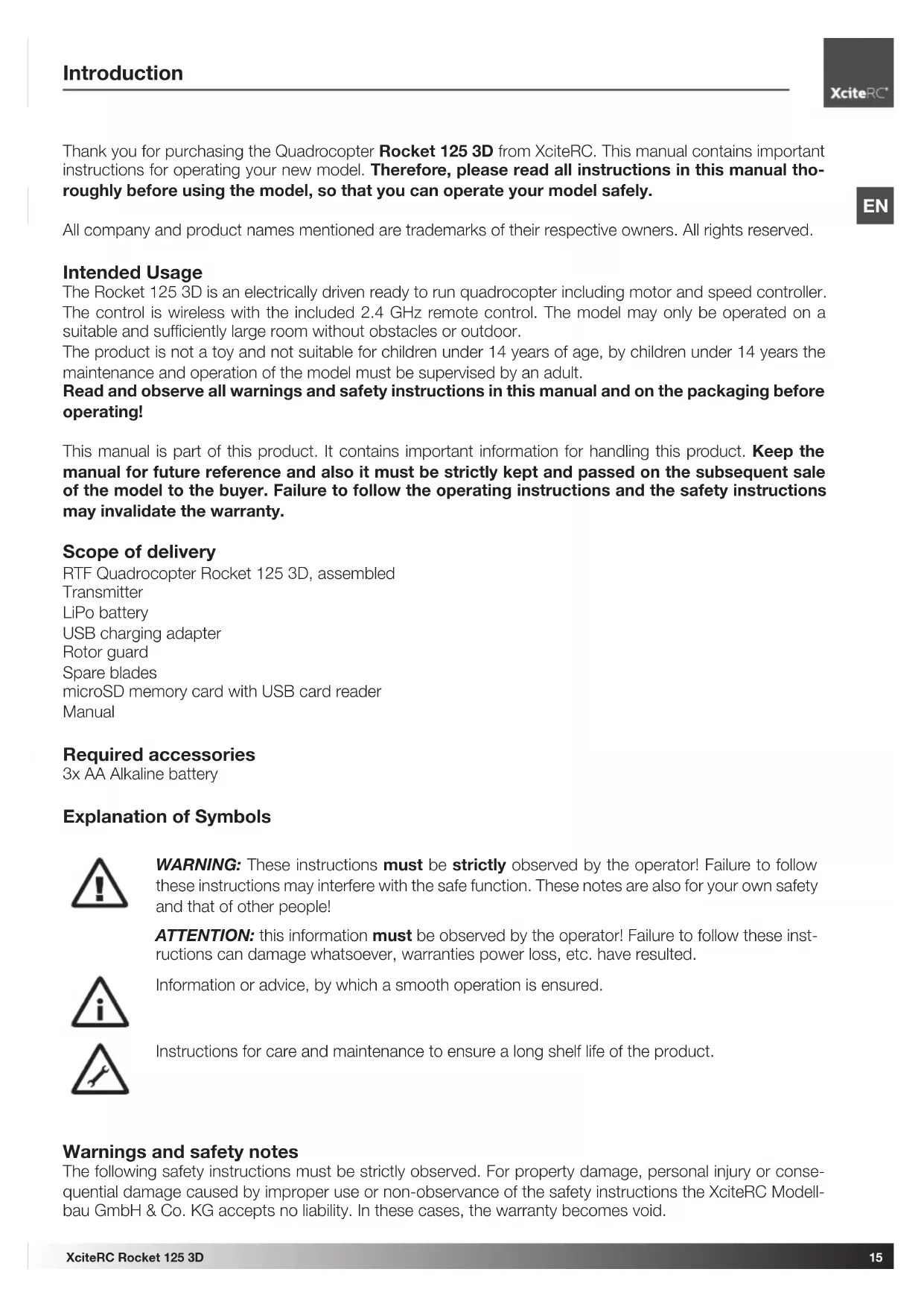 Introduction Thank you for purchasing the Quadrocopter Rocket 125 3D from XciteRC. This manual contains important instructions for operating your new model. Therefore, please read all instructions in this manual tho- roughly before using the model, so that you can operate your model safely. All company and product names mentioned are trademarks of their respective owners. All rights reserved. Intended Usage The Rocket 125 3D is an electrically driven ready to run quadrocopter including motor and speed controller. The control is wireless with the included 2.4 GHz remote control. The model may only be operated on a suitable and sufficiently large room without obstacles or outdoor. The product is not a toy and not suitable for children under 14 years of age, by children under 14 years the maintenance and operation of the model must be supervised by an adult. Read and observe all warnings and safety instructions in this manual and on the packaging before operating! This manual is part of this product. It contains important information for handling this product. Keep the manual for future reference and also it must be strictly kept and passed on the subsequent sale of the model to the buyer. Failure to follow the operating instructions and the safety instructions may invalidate the warranty. Scope of delivery RTF Quadrocopter Rocket 125 3D, assembled Transmitter LiPo battery USB charging adapter Rotor guard Spare blades microSD memory card with USB card reader Manual Required accessories 3x AA Alkaline battery Explanation of Symbols