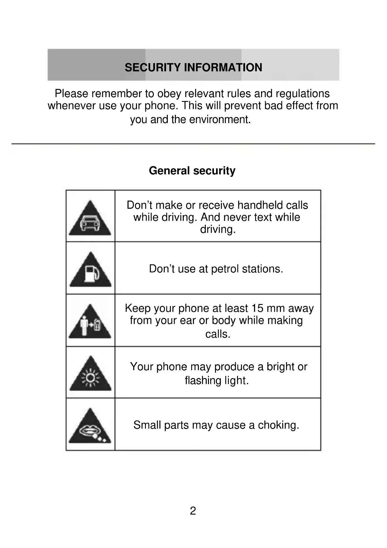 1SECURITY INFORMATION Please remember to obey relevant rules and regulations whenever use your phone. This will prevent bad effect from you and the environment.