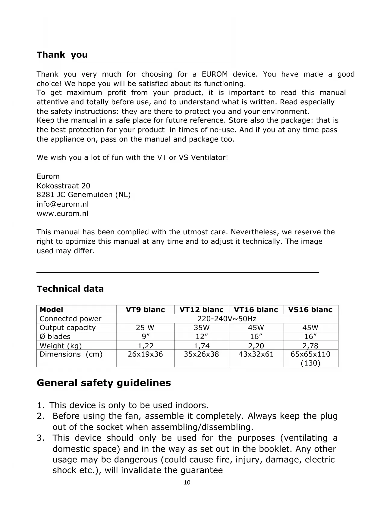 USER MANUAL VT16 Eurom