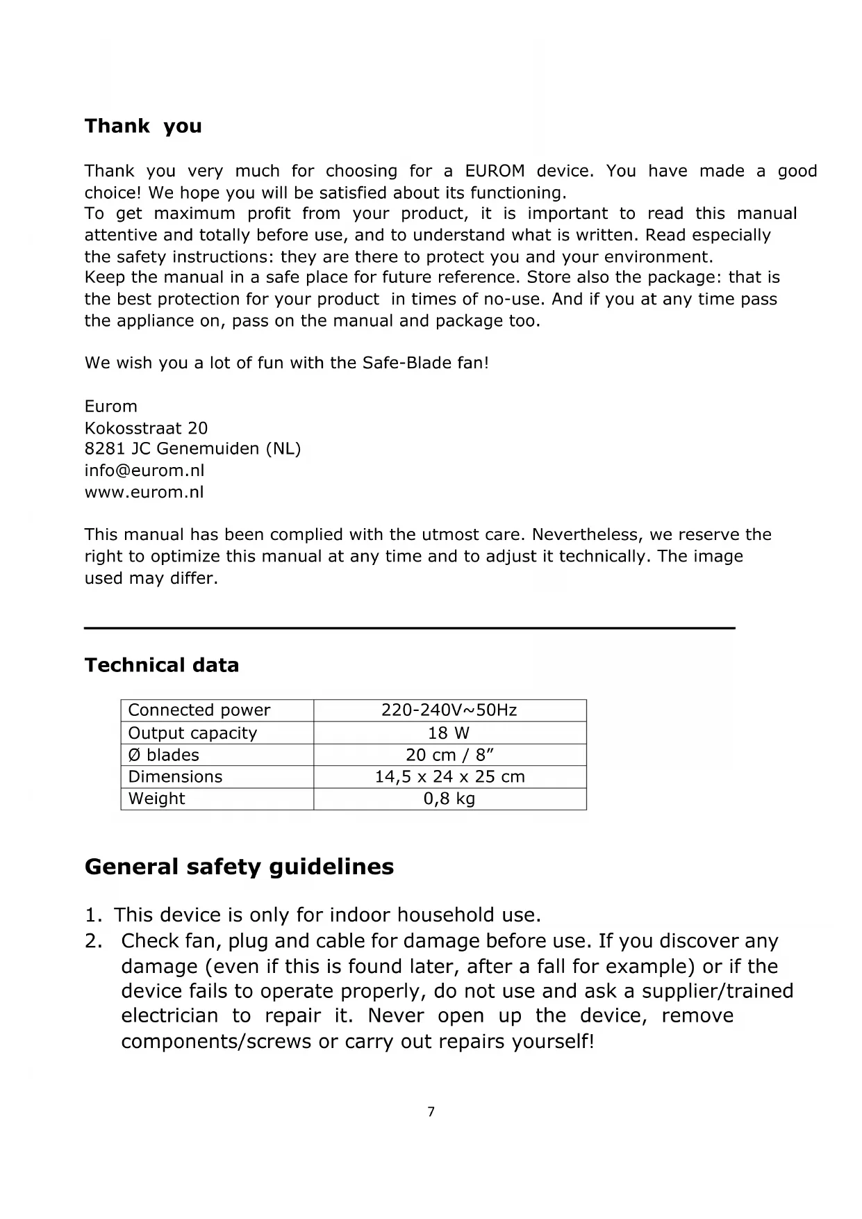 EN 61000-3-3:2013+A1:2019 RoHS 2011/65/EU&(EU)2015/863 Genemuiden, 07-10-2020 W.J. Bakker, alg. dir.7 Thank you Thank you very much for choosing for a EUROM device. You have made a good choice! We hope you will be satisfied about its functioning. To get maximum profit from your product, it is important to read this manual attentive and totally before use, and to understand what is written. Read especially the safety instructions: they are there to protect you and your environment. Keep the manual in a safe place for future reference. Store also the package: that is the best protection for your product in times of no-use. And if you at any time pass the appliance on, pass on the manual and package too. We wish you a lot of fun with the Safe-Blade fan! Eurom Kokosstraat 20 8281 JC Genemuiden (NL) info@eurom.nl www.eurom.nl This manual has been complied with the utmost care. Nevertheless, we reserve the right to optimize this manual at any time and to adjust it technically. The image used may differ.