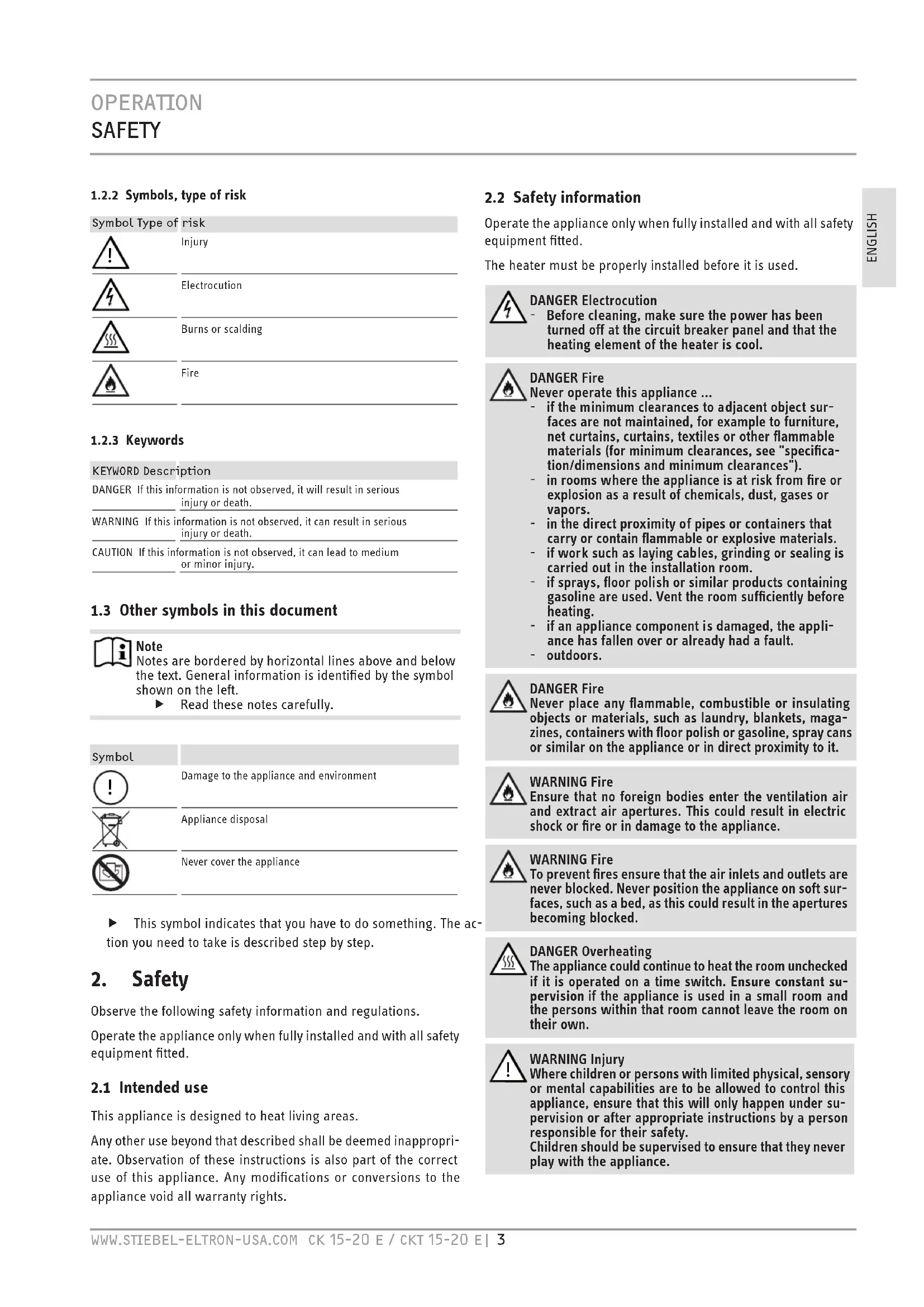KEYWORD Type of riskHere, possible consequences are listed that may result from not observing the safety information. f Steps to prevent the risk are listed.OPERATION SAFETY ENGLISHWWW.STIEBEL-ELTRON-USA.COM CK 15-20 E / CKT 15-20 E| 31.2.2 Symbols, type of riskSymbol Type of risk Injury Electrocution Burns or scalding Fire 1.2.3 KeywordsKEYWORD DescriptionDANGER If this information is not observed, it will result in serious injury or death.WARNING If this information is not observed, it can result in serious injury or death.CAUTION If this information is not observed, it can lead to medium or minor injury.