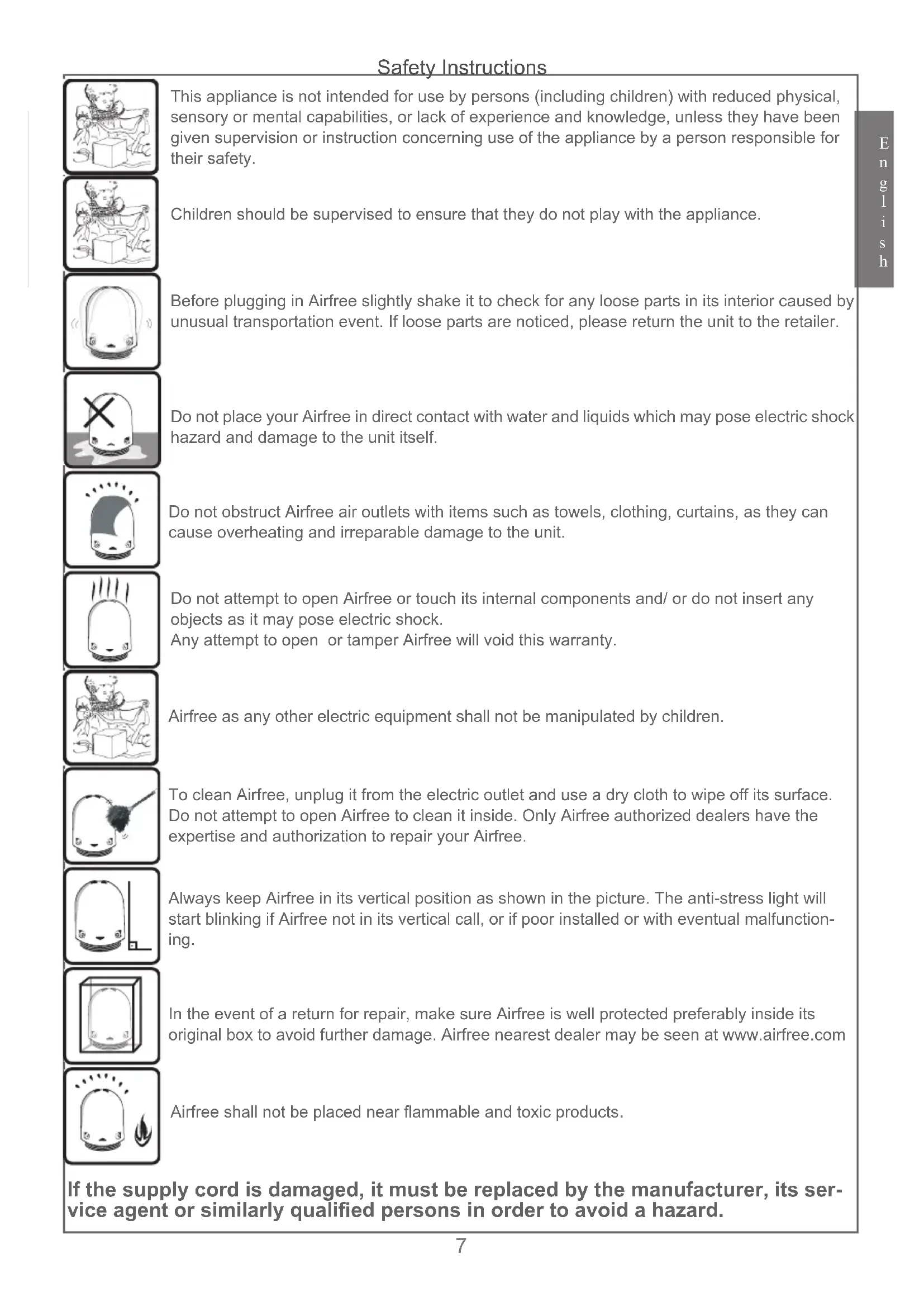 To clean Airfree, unplug it from the electric outlet and use a dry cloth to wipe off its surface. Do not attempt to open Airfree to clean it inside. Only Airfree authorized dealers have the expertise and authorization to repair your Airfree.