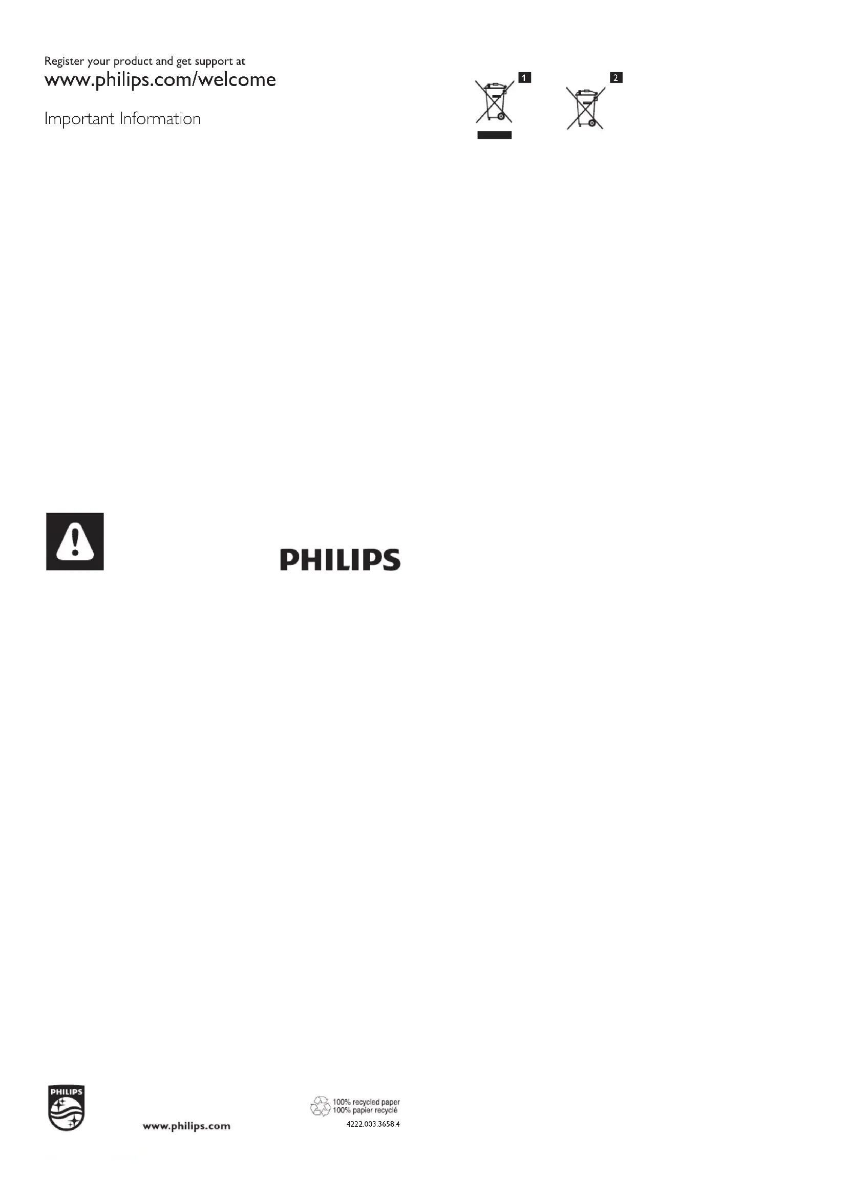 Important Information Register your product and get support at www.philips.com/welcome 1 2ENGLISH Introduction Congratulations on your purchase and welcome to Philips! To fully benet from the support that Philips offers, register your product at www.philips.com/welcome. Important Read this important information carefully before you use the appliance and save it for future reference. Danger - Never vacuum up water or any other liquid, ammable substances or hot ashes. Warning - Check if the voltage indicated on the appliance corresponds to the local mains voltage before you connect the appliance. - Do not use the appliance if the plug, the mains cord or the appliance itself is damaged. - If the mains cord is damaged, you must have it replaced by Philips, a service centre authorised by Philips or similarly qualied persons in order to avoid a hazard. - This appliance can be used by children aged from 8 years and above and persons with reduced physical, sensory or mental capabilities or lack of experience and knowledge if they have been given supervision or instruction concerning use of the appliance in a safe way and understand the hazards involved. Children shall not play with the appliance. Cleaning and user maintenance shall not be made by children without supervision. - The plug must be removed from the socket-outlet before cleaning or maintaining the appliance. - Do not point the hose, the tube or any other accessory at the eyes or ears nor put it in your mouth. Caution - Never use the appliance without the motor protection lter (located in the dustbag compartment). This could damage the motor and shorten the life of the appliance. - Only use Philips s-bag