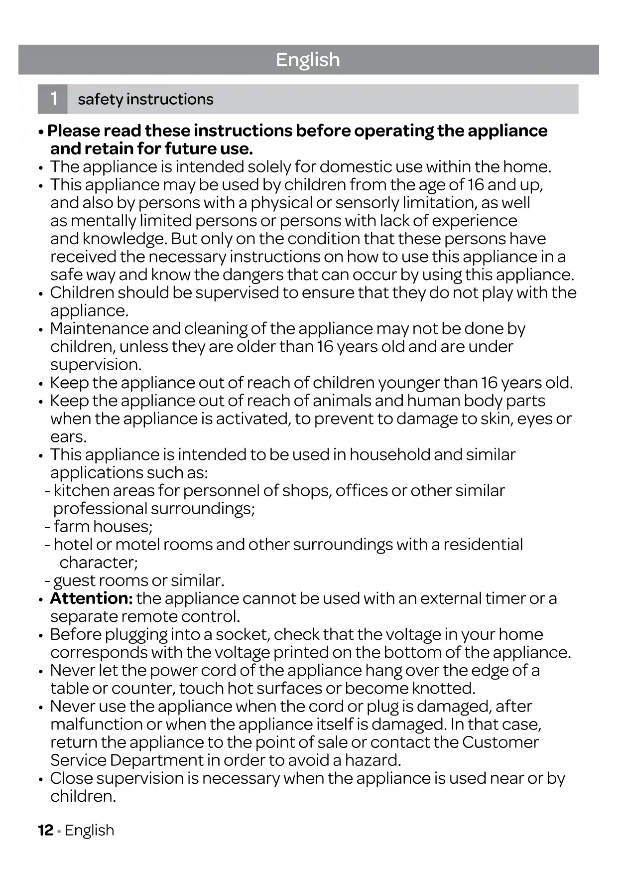 - This appliance may be used by children from the age of 16 and up, and also by persons with a physical or sensorly limitation, as well as mentally limited persons or persons with lack of experience and knowledge. But only on the condition that these persons have received the necessary instructions on how to use this appliance in a safe way and know the dangers that can occur by using this appliance.