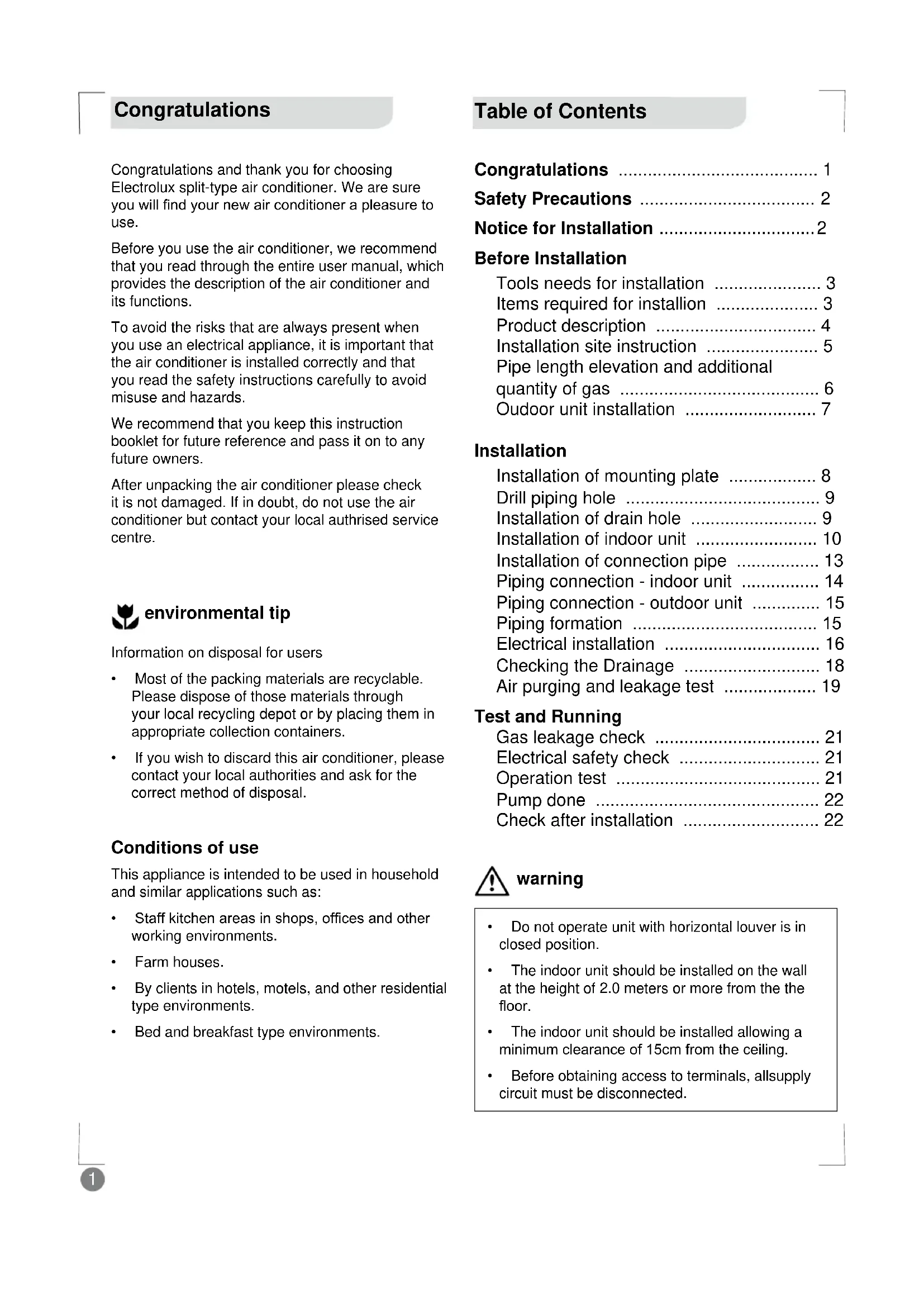 use. Before you use the air conditioner, we recommend that you read through the entire user manual, which provides the description of the air conditioner and its functions. To avoid the risks that are always present when you use an electrical appliance, it is important that the air conditioner is installed correctly and that you read the safety instructions carefully to avoid misuse and hazards. We recommend that you keep this instruction booklet for future reference and pass it on to any future owners. After unpacking the air conditioner please check it is not damaged. If in doubt, do not use the air conditioner but contact your local authrised service centre. Information on disposal for users Most of the packing materials are recyclable. Please dispose of those materials through your local recycling depot or by placing them in appropriate collection containers. If you wish to discard this air conditioner, please contact your local authorities and ask for the correct method of disposal. Conditions of use This appliance is intended to be used in household and similar applications such as: 6WDIINLWFKHQDUHDVLQVKRSVRI¿FHVDQGRWKHU working environments. Farm houses. By clients in hotels, motels, and other residential type environments. Bed and breakfast type environments. warning environmental tip2 Notice for Installation