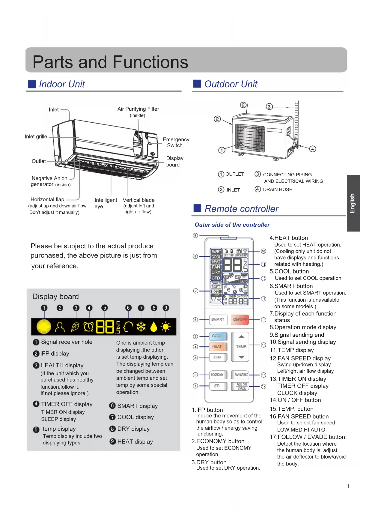 status operation.the body. Outer side of the controller temp display Negative AnionInlet grilleAir Purifying FilterOutletHorizontal flapDisplayboard(adjust left and Vertical bladeEmergency Switch generator(inside)Inlet(inside)Intelligent eye Please be subject to the actual produce purchased, the above picture is just from your reference. AND ELECTRICAL WIRING(adjust up and down air flowDon’t adjust it manually)right air flow)One is ambient temp displaying ,the other is set temp displaying. The displaying temp can be changed between ambient temp and set temp by some special operation.Temp display include two displaying types.