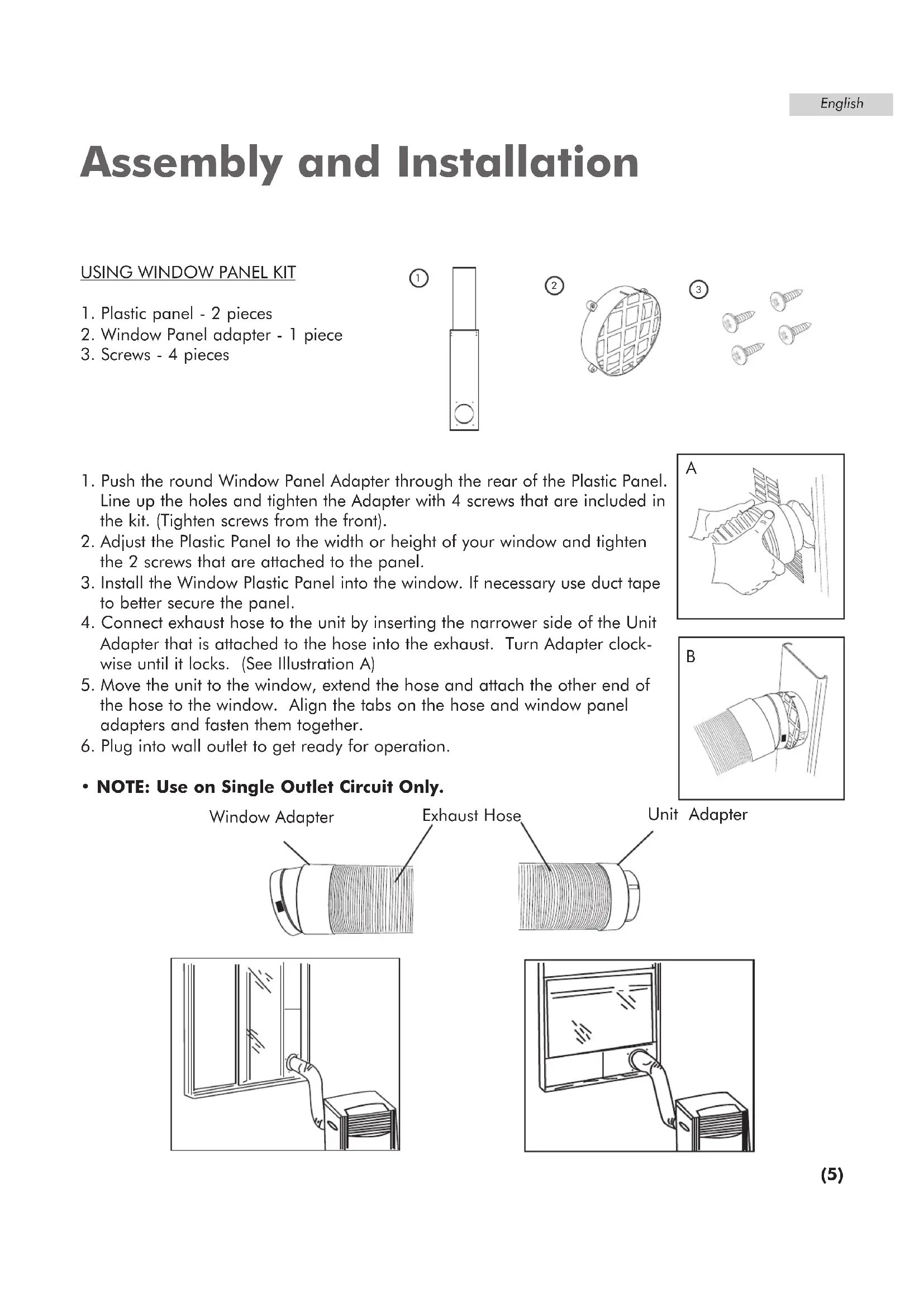 - Easy to install window kit is included, which consists of the exhaust hose, 2 hose adapters, the window panel kit and window panel adapter.