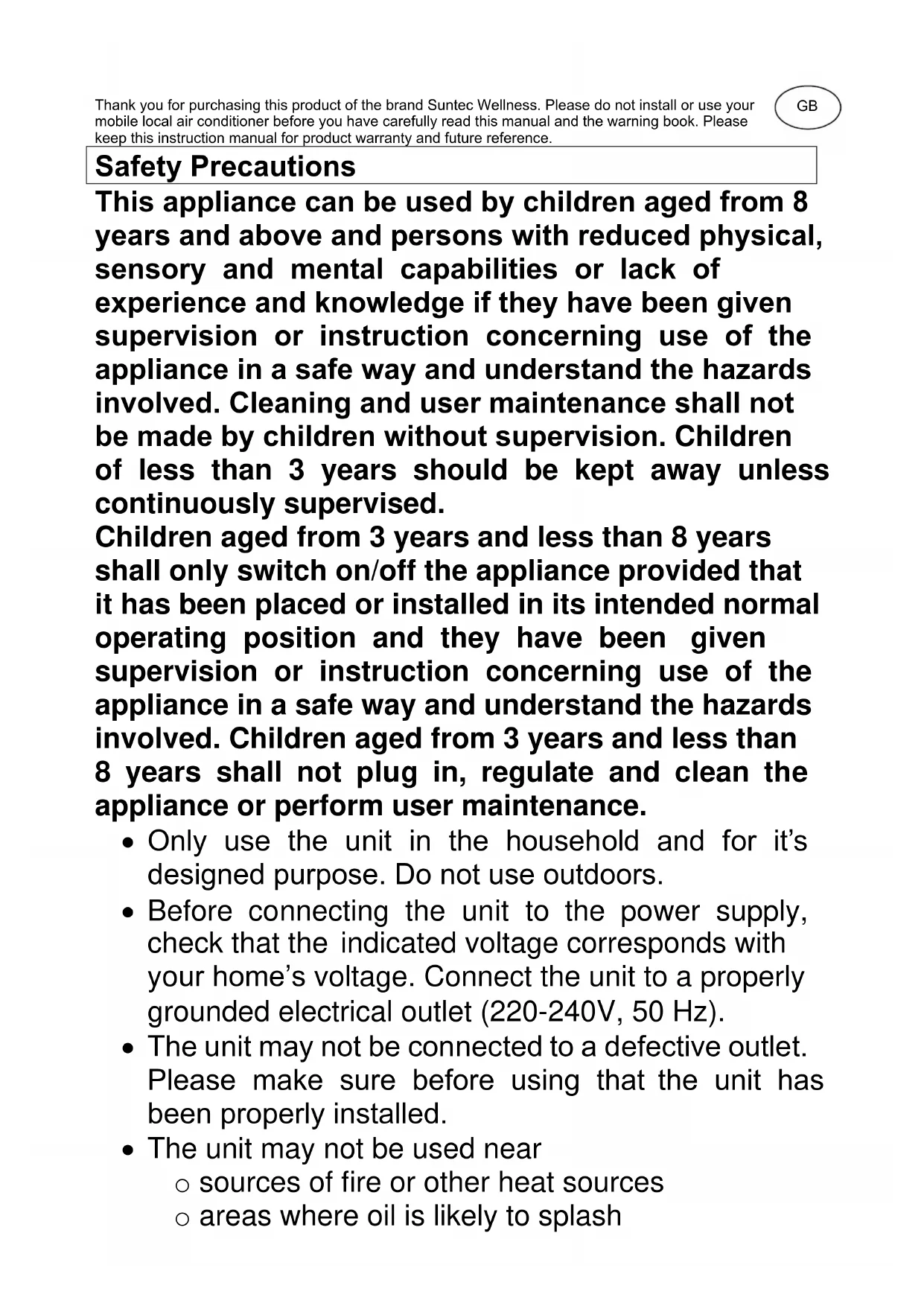 IMPULS Eco R290 SUNTEC WELLNESS GMBH / HOLZSTRASSE 2 / 40 221 DÜSSELDORF / DEUTSCHLANDThank you for purchasing this product of the brand Suntec Wellness. Please do not install or use your mobile local air conditioner before you have carefully read this manual and the warning book. Please keep this instruction manual for product warranty and future reference. Safety Precautions This appliance can be used by children aged from 8 years and above and persons with reduced physical, sensory and mental capabilities or lack of experience and knowledge if they have been given supervision or instruction concerning use of the appliance in a safe way and understand the hazards involved. Cleaning and user maintenance shall not be made by children without supervision. Children of less than 3 years should be kept away unless continuously supervised. Children aged from 3 years and less than 8 years shall only switch on/off the appliance provided that it has been placed or installed in its intended normal operating position and they have been given supervision or instruction concerning use of the appliance in a safe way and understand the hazards involved. Children aged from 3 years and less than 8 years shall not plug in, regulate and clean the appliance or perform user maintenance.