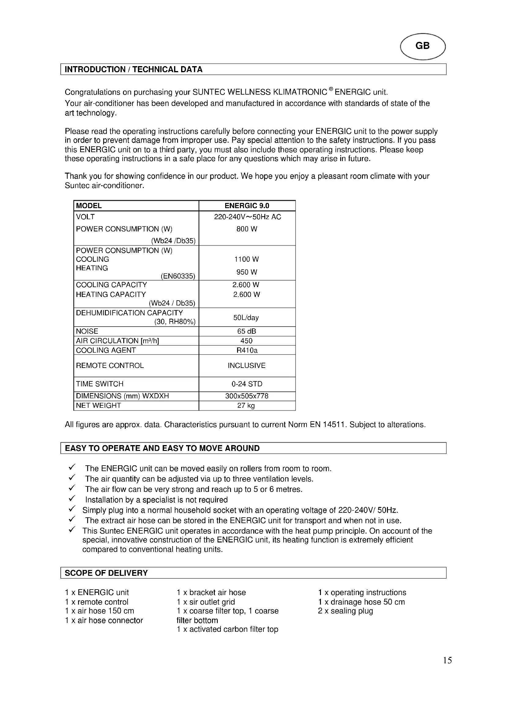 ENERGIC unit. Your air-conditioner has been developed and manufactured in accordance with standards of state of the art technology. Please read the operating instructions carefully before connecting your ENERGIC unit to the power supply in order to prevent damage from improper use. Pay special attention to the safety instructions. If you pass this ENERGIC unit on to a third party, you must also include these operating instructions. Please keep these operating instructions in a safe place for any questions which may arise in future. Thank you for showing confidence in our product. We hope you enjoy a pleasant room climate with your Suntec air-conditioner. MODEL ENERGIC 9.0 VOLT 220-240V~50Hz AC POWER CONSUMPTION (W) 800 W (Wb24 /Db35) POWER CONSUMPTION (W) COOLING 1100 W HEATING (EN60335) 950 W COOLING CAPACITY