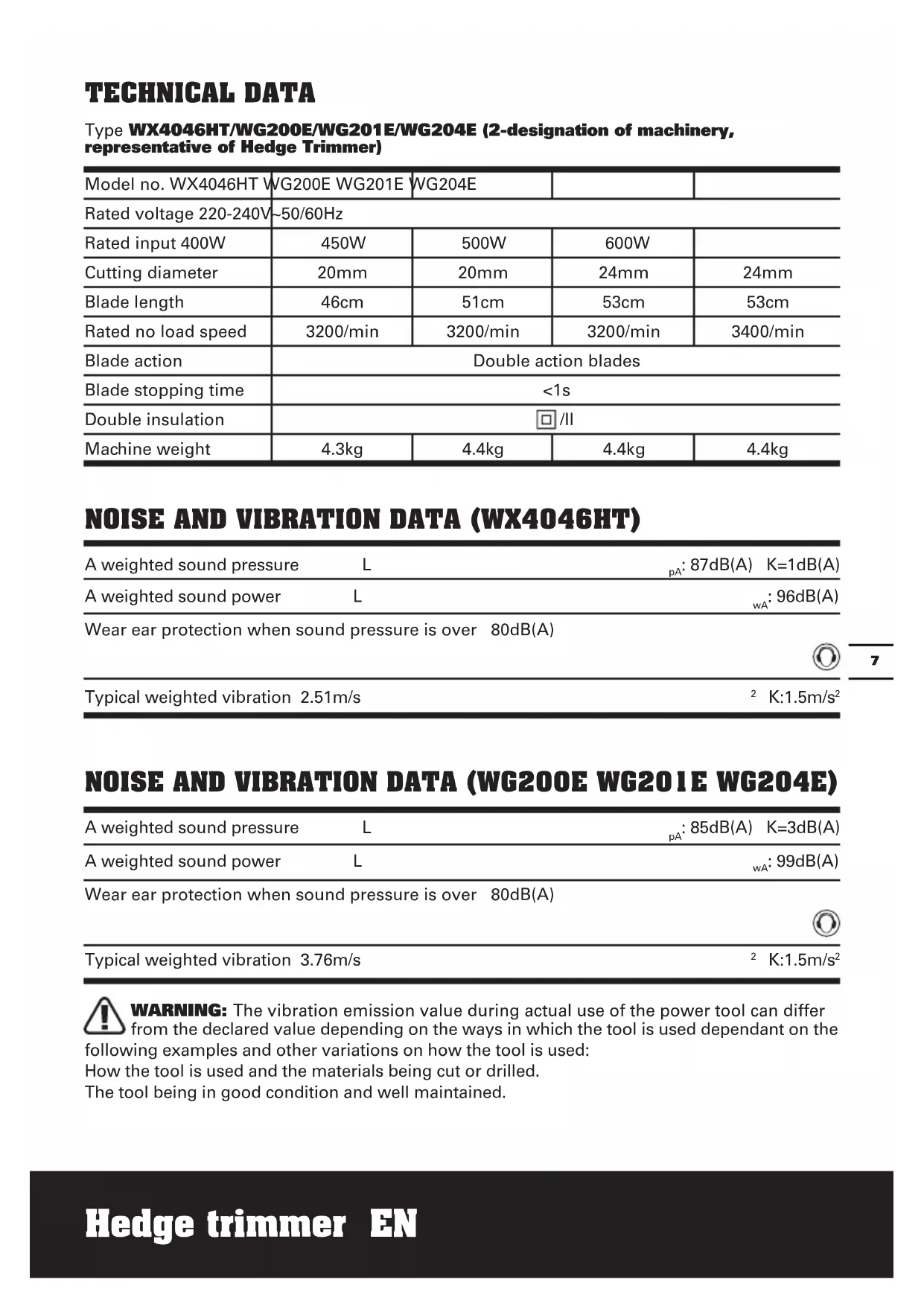 from the declared value depending on the ways in which the tool is used dependant on the following examples and other variations on how the tool is used: How the tool is used and the materials being cut or drilled. The tool being in good condition and well maintained. Model no. WX4046HT WG200E WG201E WG204E Rated voltage 220-240V~50/60Hz Rated input 400W 450W 500W 600W Cutting diameter 20mm 20mm 24mm 24mm Blade length 46cm 51cm 53cm 53cm Rated no load speed 3200/min 3200/min 3200/min 3400/min Blade action Double action blades Blade stopping time <1s Double insulation /II Machine weight 4.3kg 4.4kg 4.4kg 4.4kgHedge trimmer En