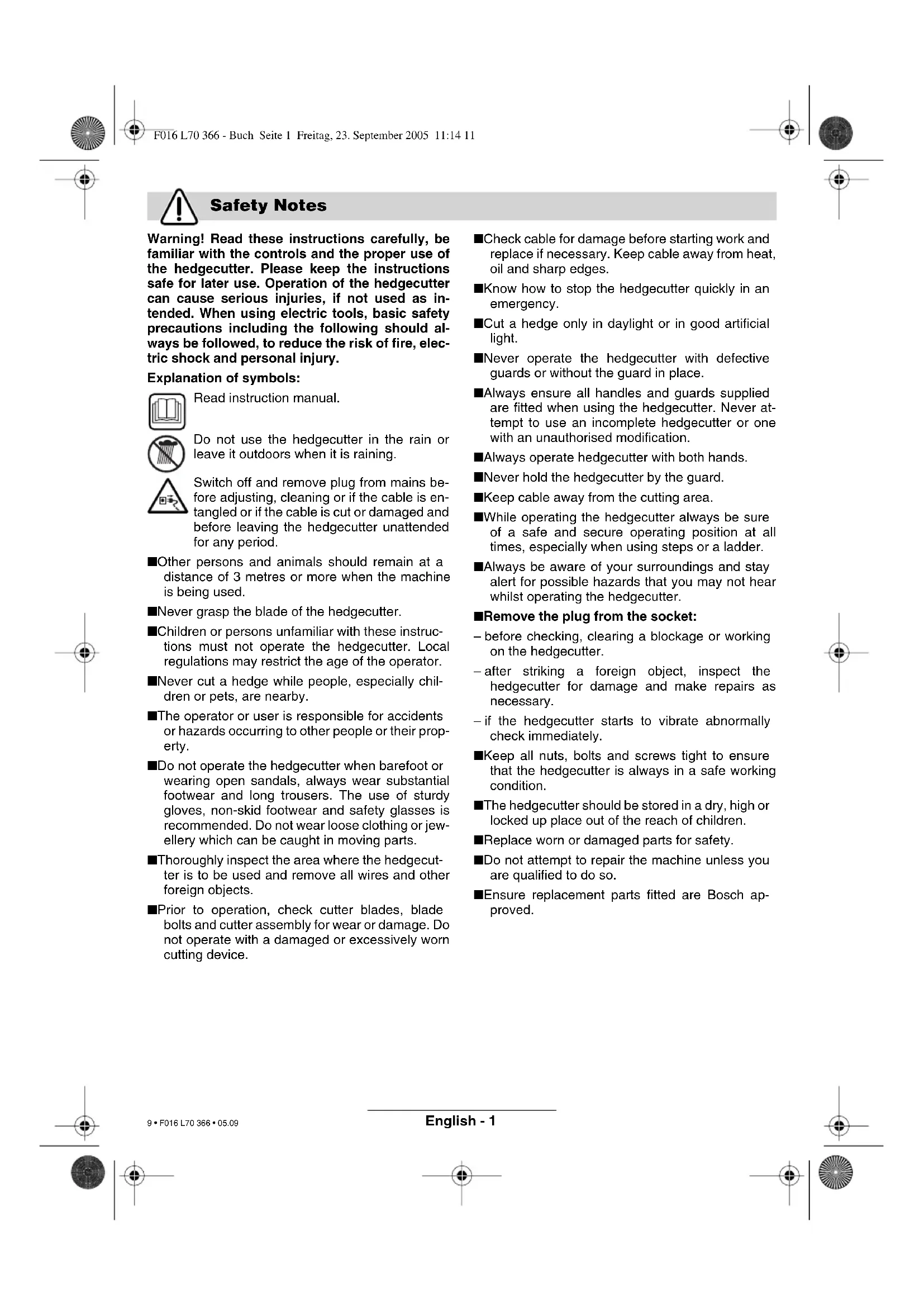 - 600 H48 A 600 H48 B Rated power 600 W 700 W 700 W No-load stroke rate 1400 spm 1500 spm 1500 spm Blade spacing 24 mm 34 mm 34 mm Cutting length 650 mm 600 mm 700 mm Weight 4.25 kg 4.1 kg 4.2 kg Protection class / II / II / II Intended Use Introduction Delivered Items Operating Controls For Your Safety Warning! Switch off, remove plug from mains before adjusting, cleaning or if cable is cut, damaged or entangled. The blades continue to move for a few frac- tions of a seconds after the hedgecutter is switched off. Caution! Do not touch the mov- ing blades. F016 L70 366 - Buch Seite 2 Freitag, 23. September 2005 11:14 11 10 • F016 L70 366 • 05.09English - 3 It is recommended for increased electrical safety to use a Residual Current Device (RCD) with a tripping current of not more than 30 mA. Always check your RCD every time you use it. For products not sold in GB: WARNING: For safety, it is essential that the mains plug 6 attached to the machine is fitted to the power supply cable 9 as shown. The couplings of connection leads must be pro- tected against splashes and the coupling sockets on the leads must be made of rubber or coated with rubber. Fixing means for the connection leads must be used. The connection lead must be inspected for signs of damage at regular intervals and may only be used if in perfect condition. If the supply cord is damaged, it must be replaced by a Bosch Service Centre. Products sold in GB only: Your hedgecutter is fitted with an approved 13 A (BS 1363/A) electric plug and is protected by a 13 A fuse (ASTA Approved to BS 1362). If the fitted plug is not suitable for your socket out- lets, it should be cut off and an appropriate plug fit- ted in its place. The severed plug must be disposed of to avoid a possible shock hazard and should never be inserted into a 13 A socket elsewhere. Starting: Press and hold rear switch lever 5. Squeeze any front lever 3. Stopping: Release any of switch levers 3 and 5. Note: The machine is fitted with a sliding clutch which protect the motor from being damaged should be the blade lock against a solid object. Should the machine lockup switch off immediately and pull mains plug before removing the object from the blade. Hold the hedgecutter away from yourself using both hands. Stand in a secure and stable position. Position the extension cord over your shoulder to the rear and ensure that the cord is behind you at all times during cutting. Never place the cable over the hedge, where it could easily be cut by the blades. Cut stems up to 24 mm (34 mm, AHS 6000/ 7000 PRO-T) in thickness. When cutting, move steadily along the line of cut, so that stems are fed directly into the cutter blades. The double edge of the cutting blade enables cutting to either direction, or with a side to side motion. Cut the sides of the hedge first, then the top. To keep the sides flat, cutting upwards with the growth is recommended. Younger stems tend to move outwards when cutting them from top to bot- tom, resulting in shallow patches or holes in the hedge. To reach a level finish, fasten a piece of string along the length of the hedge at the required height and use as an alignment guide. Cut the hedge just above the string. Take care to avoid cutting into objects such as wire, which could cause damage to the cutting blades and the drive. Recommended cutting/trimming times: – Cut hedges with deciduous leaves in June and October. – Cut evergreen hedges in April and August. – Cut conifer and other fast growing shrubs approx. every six weeks from May onwards. – Shaping hedges should be cut to achieve a form as shown in figure. Before any work on the machine itself, pull the mains plug. Note: To ensure long and reliable service, carry out the following maintenance regularly. Check for obvious defects such as loose, dislodged or damaged blade, loose fixings and worn or dam- aged components. Check that covers and guards are undamaged and correctly fitted. Carry out necessary maintenance or repairs before using. If the hedgecutter should happen to fail despite the care taken in manufacturing and testing, repair should be carried out by an authorized customer service agent for Bosch garden products. For all correspondence and spare parts orders, al- ways include the 10-digit part number (TYP) from the nameplate of the machine! Starting and Stopping Tips on Cutting p. 3