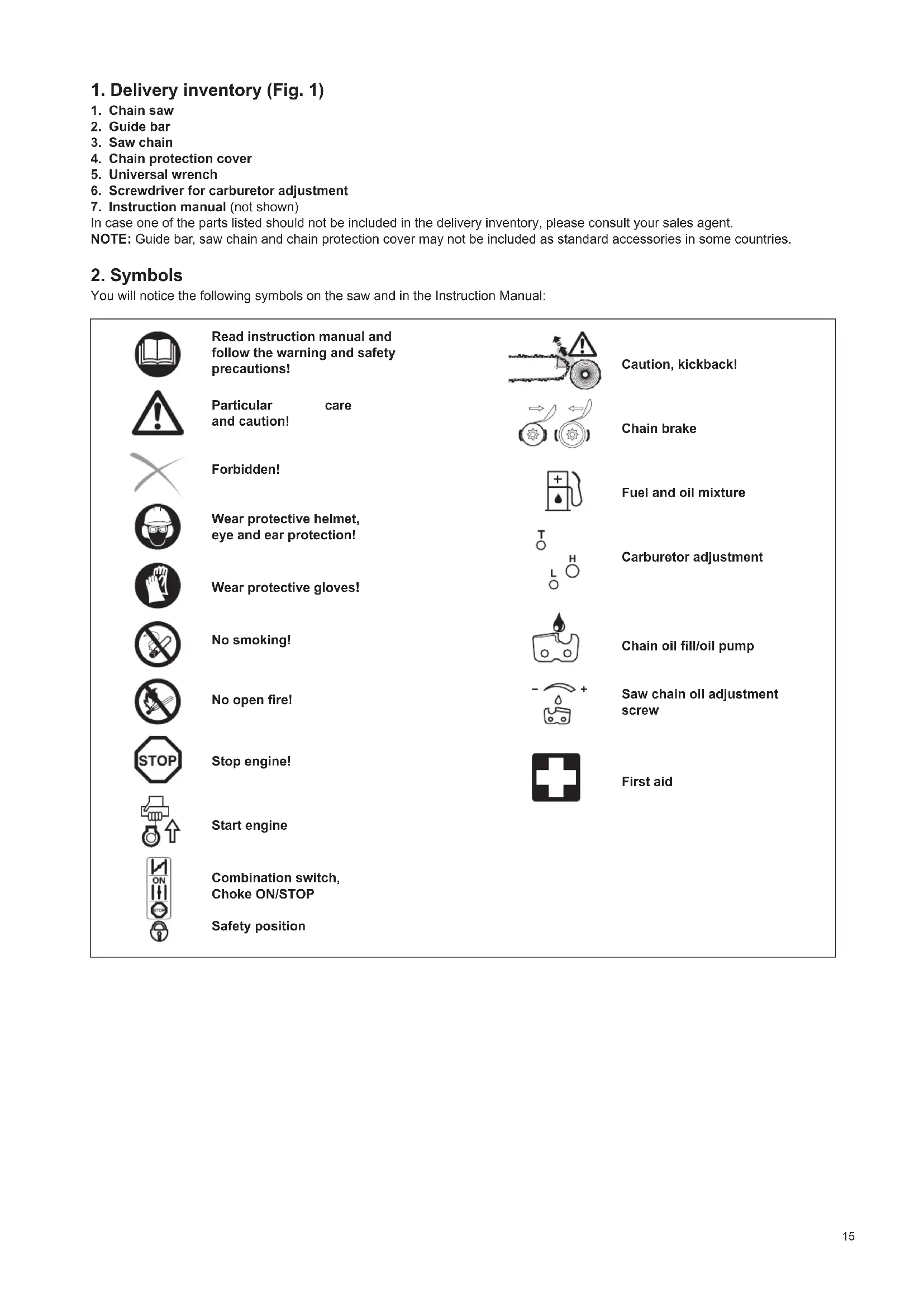 In case one of the parts listed should not be included in the delivery inventory, please consult your sales agent. NOTE: Guide bar, saw chain and chain protection cover may not be included as standard accessories in some countries.