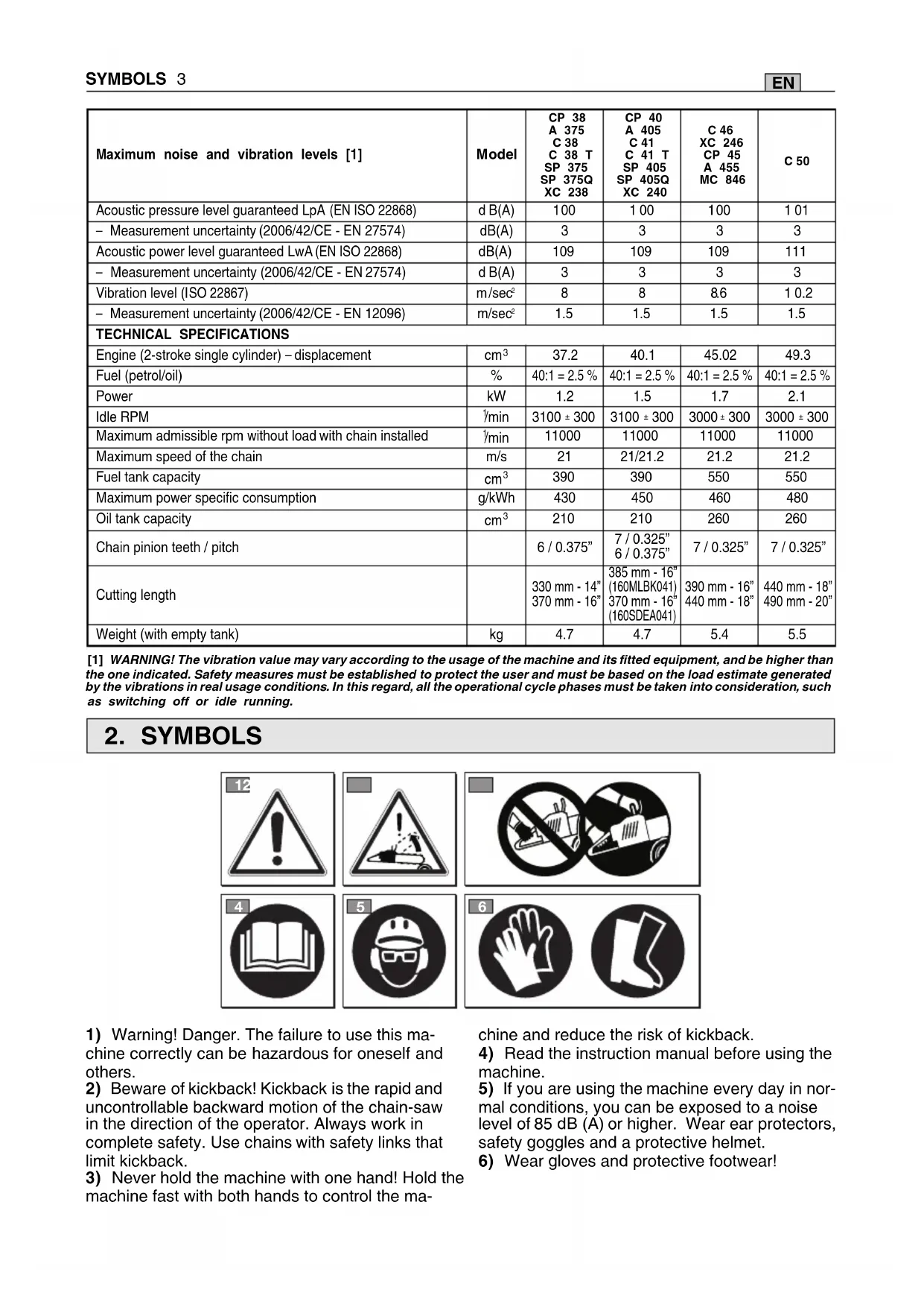 Chain pinion teeth / pitch 6 / 0.375” 7 / 0.325” 6 / 0.375” 7 / 0.325” 7 / 0.325” Cutting length 330 mm - 14” 370 mm - 16” 385 mm - 16” (160MLBK041) 370 mm - 16” (160SDEA041) 390 mm - 16” 440 mm - 18” 440 mm - 18” 490 mm - 20” Weight (with empty tank) kg 4.7 4.7 5.4 5.5 [1] WARNING! The vibration value may vary according to the usage of the machine and its fitted equipment, and be higher than the one indicated. Safety measures must be established to protect the user and must be based on the load estimate generated by the vibrations in real usage conditions. In this regard, all the operational cycle phases must be taken into consideration, such as switching off or idle running.EN