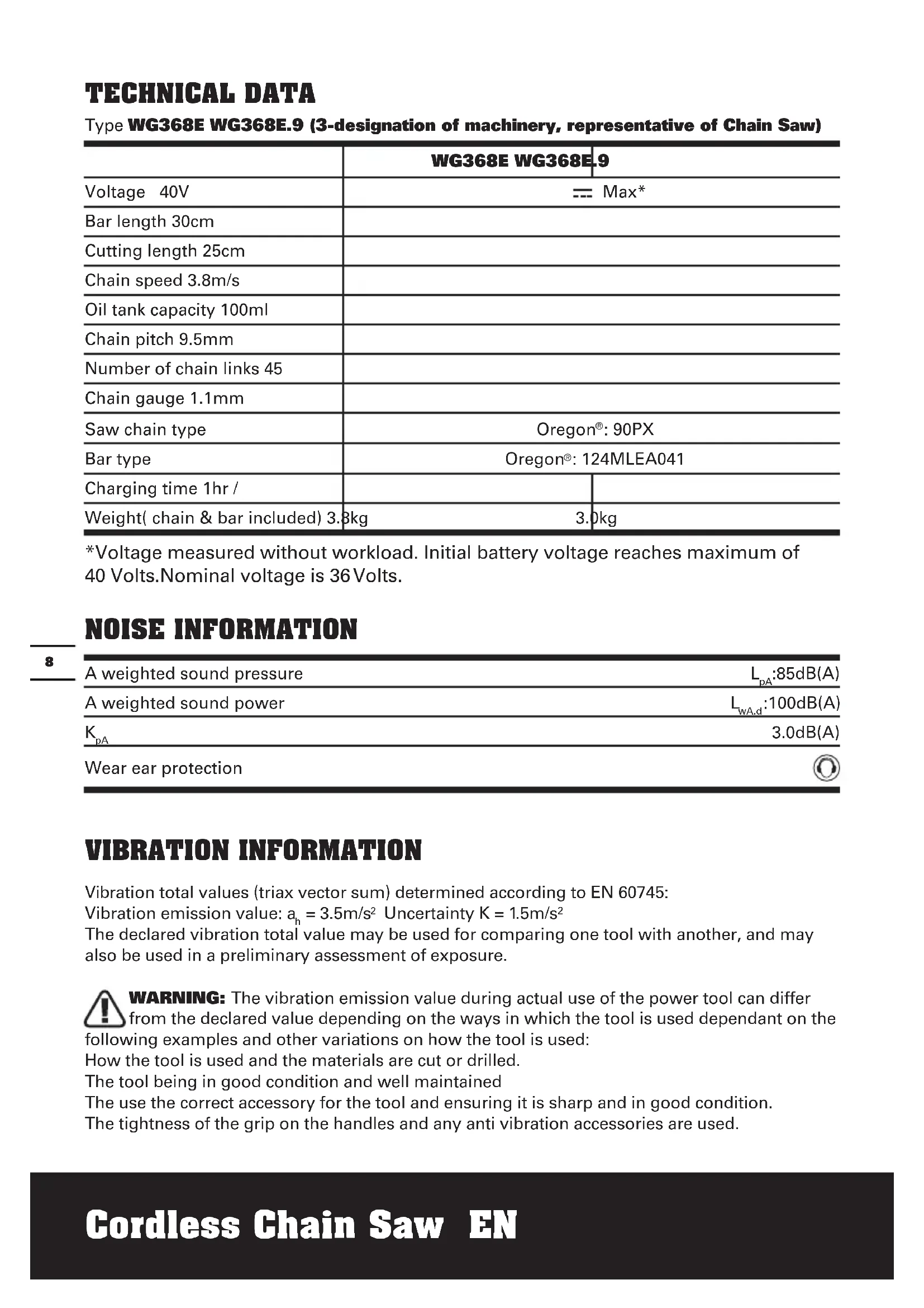 TECHNICAL DATA Type WG368E WG368E.9 (3-designation of machinery, representative of Chain Saw) WG368E WG368E.9 Voltage 40V Max* Bar length 30cm Cutting length 25cm Chain speed 3.8m/s Oil tank capacity 100ml Chain pitch 9.5mm Number of chain links 45 Chain gauge 1.1mm Saw chain type Oregon