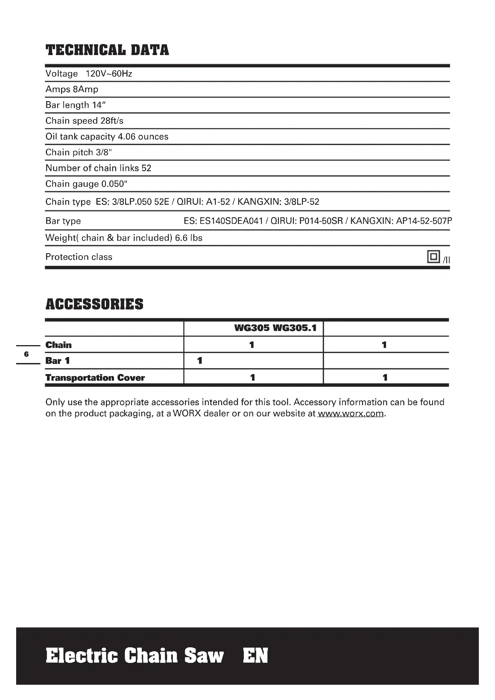 TECHNICAL DATA Voltage 120V~60Hz Amps 8Amp Bar length 14“ Chain speed 28ft/s Oil tank capacity 4.06 ounces Chain pitch 3/8" Number of chain links 52 Chain gauge 0.050" Chain type ES: 3/8LP.050 52E / QIRUI: A1-52 / KANGXIN: 3/8LP-52 Bar type ES: ES140SDEA041 / QIRUI: P014-50SR / KANGXIN: AP14-52-507P Weight( chain & bar included) 6.6 lbs Protection class /II ACCESSORIES WG305 WG305.1 Chain 1 1 Bar 1 1 Transportation Cover 1 1 Only use the appropriate accessories intended for this tool. Accessory information can be found on the product packaging, at a WORX dealer or on our website at www.worx.com.Electric Chain Saw EN