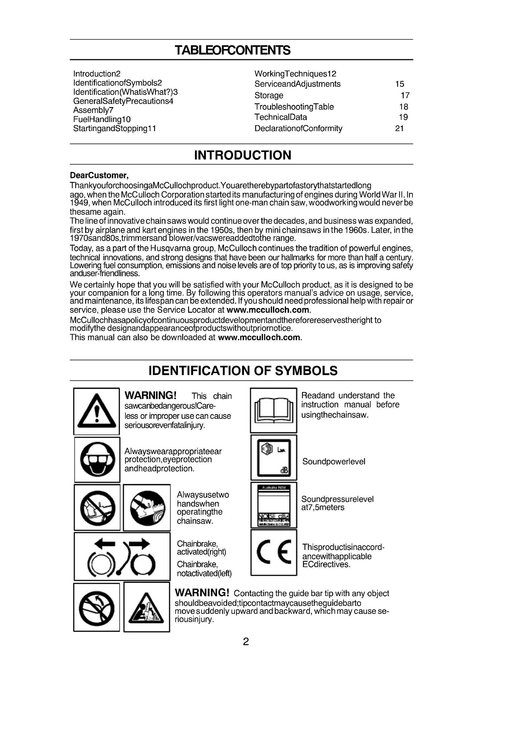 Introduction 2 Identification of Symbols 2 Identification (What is What?) 3 General Safety Precautions 4 Assembly 7 Fuel Handling 10 Starting and Stopping 11 Working Techniques 12 Service and Adjustments 15 Storage 17 Troubleshooting Table 18 Technical Data 19 Declaration of Conformity 21 INTRODUCTION Dear Customer , Thank you for choosing a McCulloch product. You are thereby part of a story that started long ago, when the McCulloch Corporation started its manufacturingof engines during WorldWar II. In 1949, when McCulloch introduced its first light one-man chain saw, woodworking would never be the same again. The line of innovative chain saws would continue over thedecades, and business was expanded, first by airplane and kart engines in the 1950s, then by mini chainsaws in the 1960s. Later, in the 1970s and 80s, trimmers and blower/vacs were added to the range. Today, as a part of the Husqvarna group, McCulloch continues the tradition of powerful engines, technical innovations, and strong designs that have been our hallmarks for more than half a century. Lowering fuel consumption, emissions and noise levels are of top priority to us, as is improving safety and user-friendliness. We certainly hope that you will be satisfied with your McCulloch product, as it is designed to be your companion for a long time. By following this operators manual’s advice on usage, service, and maintenance, its lifespancan beextended.If you should needprofessional help with repair or service, please use the Service Locator at www.mcculloch.com. McCulloch has a policy of continuous product development and therefore reserves the right to modify the design and appearance of products without prior notice. This manual can also be downloaded at www.mcculloch.com.
